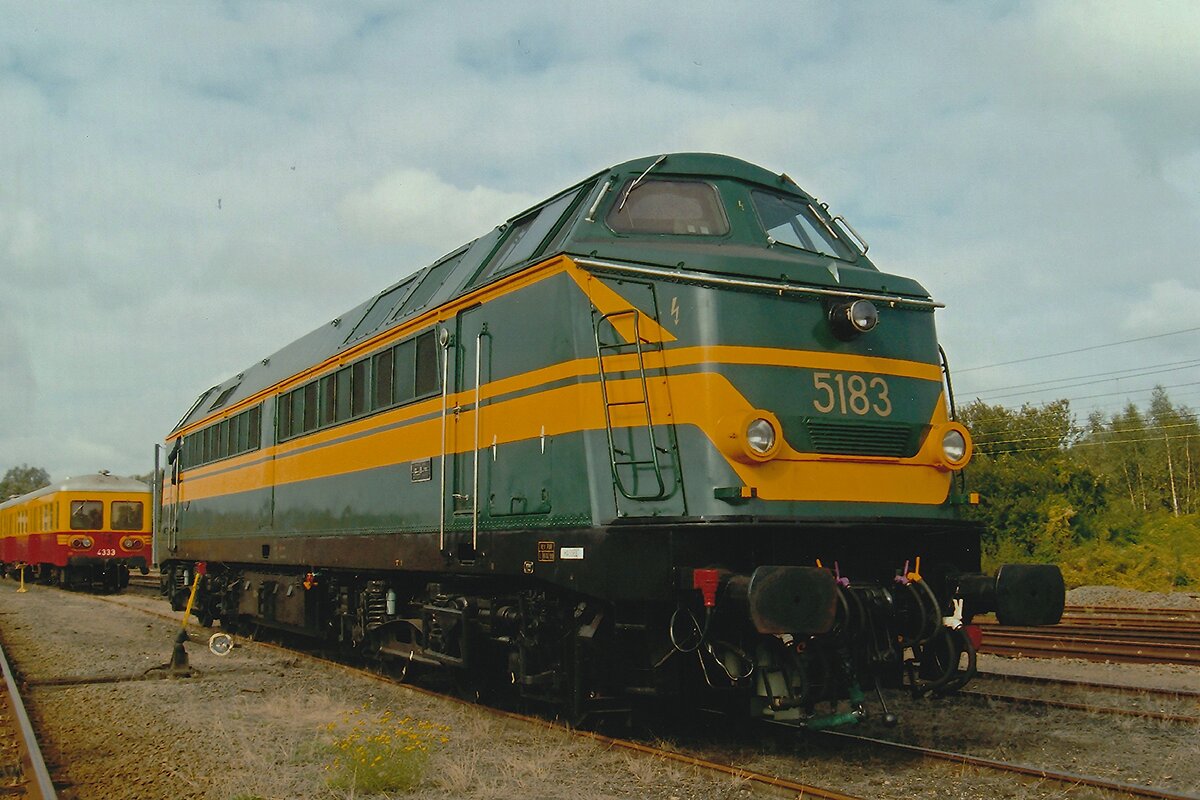 Leider existiert dieser maskerade nicht mehr. Ex-NMBS 5117 wurde in 2009 umgezaubert in 5001, eine Testdiesellok aud die 70er jahre, womit die NMBS versuchte, eine 140 km/h schnelle Diesellok bereit zu stellen. Pannenreihen und die vortschreitende Elektrifikation beschränkte die Ära des 5001s auf nür wenige Jahre und die 5001 wurde 1978 zurückgebaut. Die PFt-TSP baute 2009 deren 5117 in die 5001 Blauwe Vogel (Blauer Vogel) um, aber auch dieser Lok könnte sich nicht durchhalten und wurde Ende 2017 verschrottet. Hier steht der Quasi 5001 am 12 September 2009 ins Bw Saint-Ghislain. Leon Schrijvers