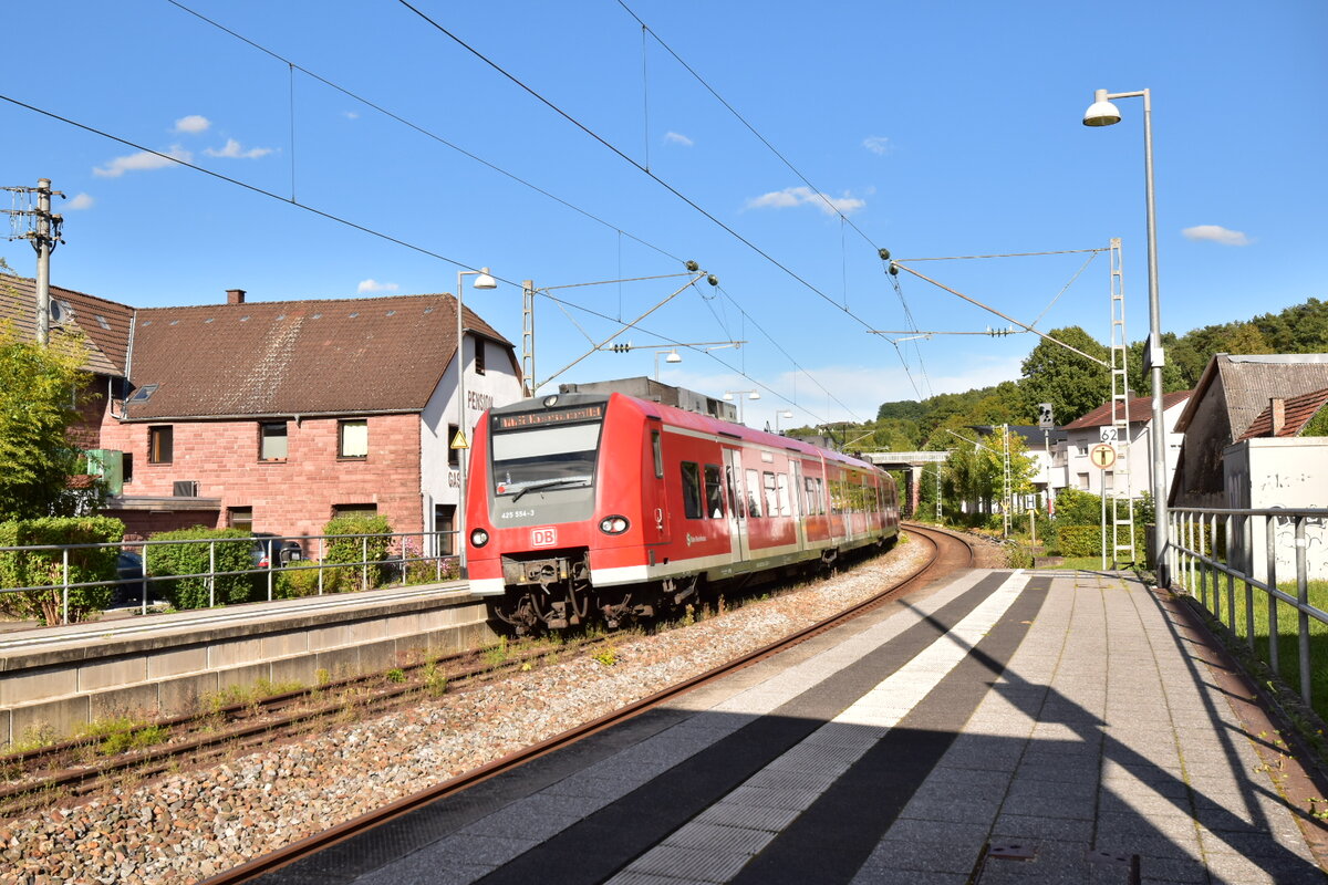 Am Mittwoch den 3. September 2025 ist am späteren Nachmittag ein S2 Zug vom 425 554-3 geführt, bei seiner Einfahrt in Auerbach bei Mosbach zu sehen. Die Sation liegt im Gefälle, als auch gleichzeitig in einem Bogen