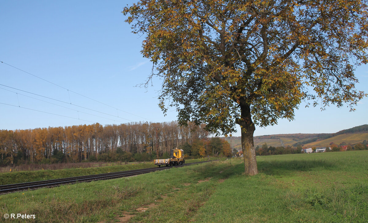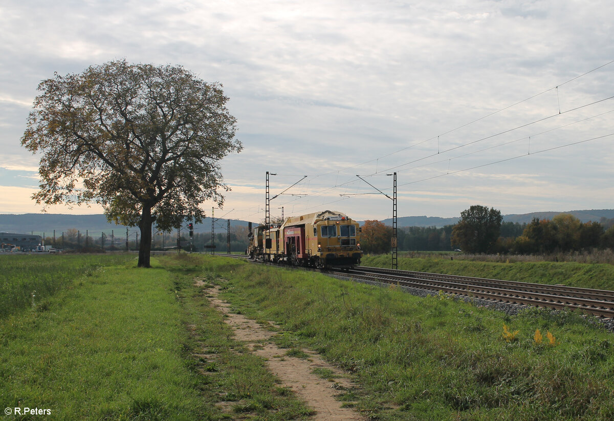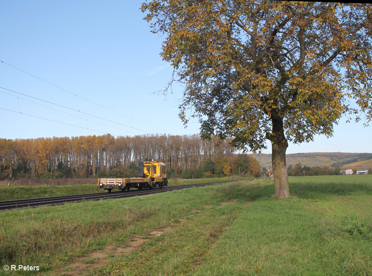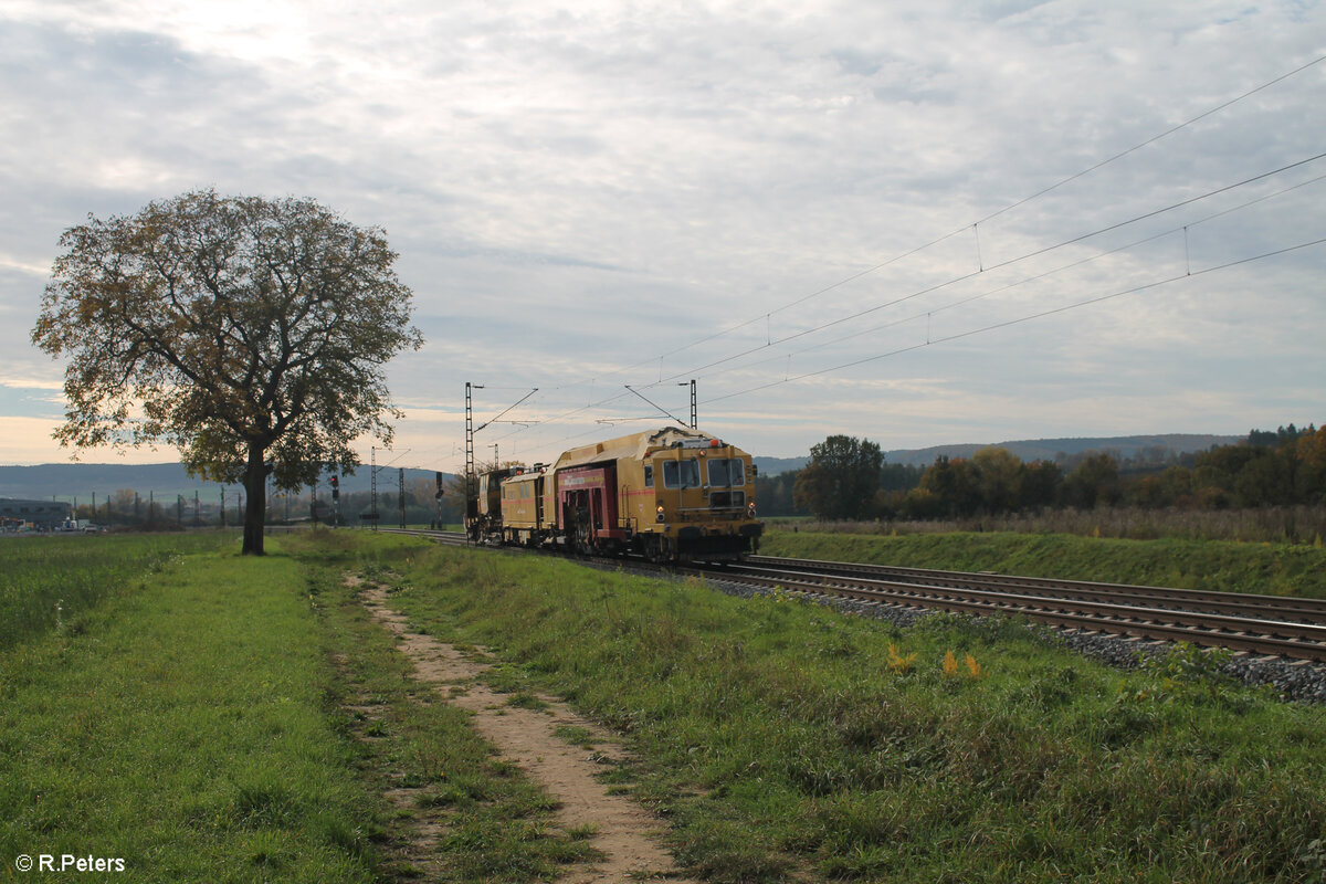 Im Block hinter der Regionalbahn rollt eine Stopfmaschine+ Schotterbesen bei Retzbach-Zellingen hinterher 21.10.24