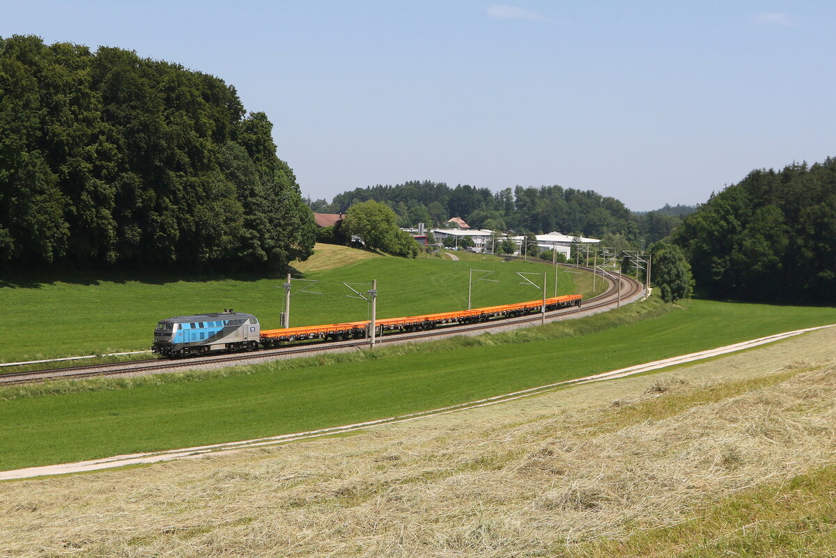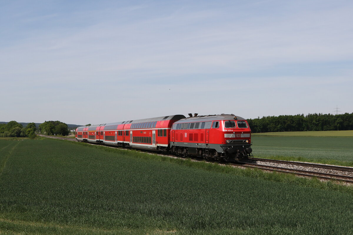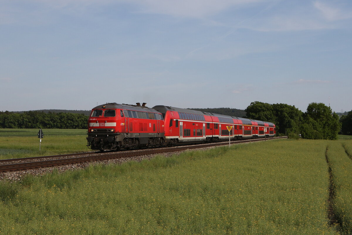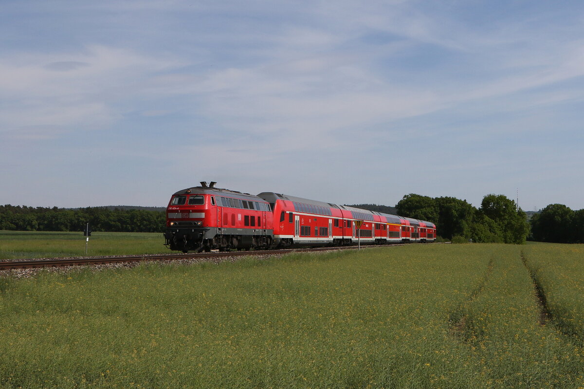 218 392 mit einem Fahrweg-Messzug am 10. April 2017 bei Hilperting.