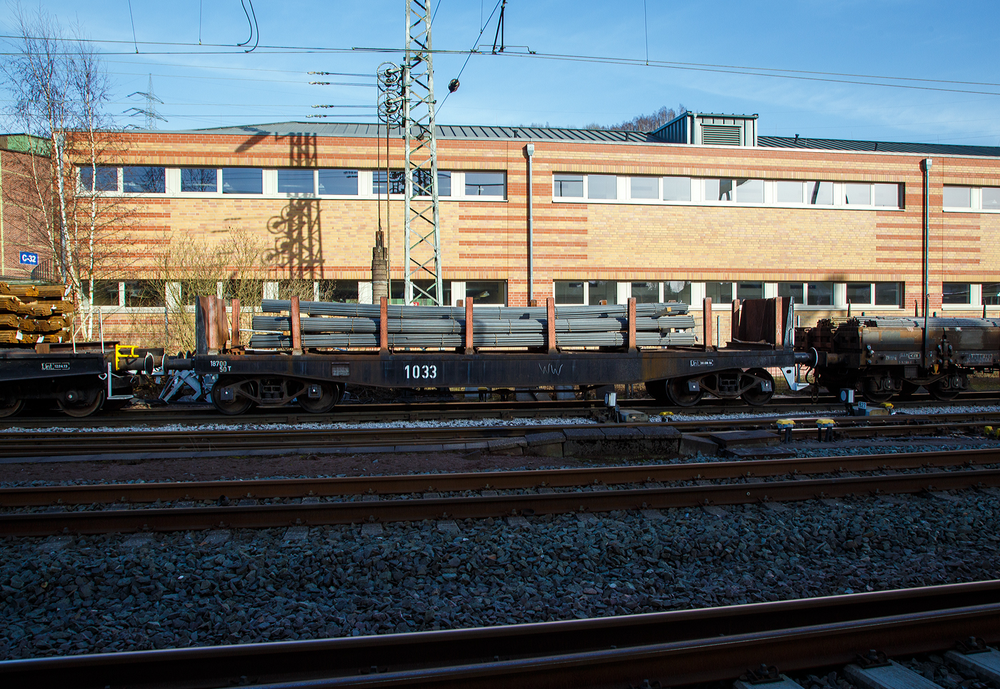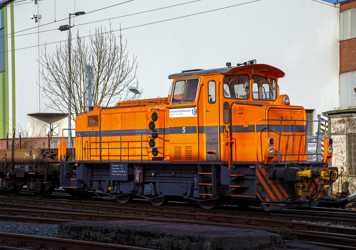 Die DEW 7 (Lok 7 der Deutschen Edelstahlwerke GmbH), zuvor Edelstahlwerke Südwestfalen, rangiert am 26.10.209, mit einem sechsachsigen Drehgestellflachwagen am Haken, vom Anschlussgleis zurück aufs Werksgelände in Siegen-Geisweid.
