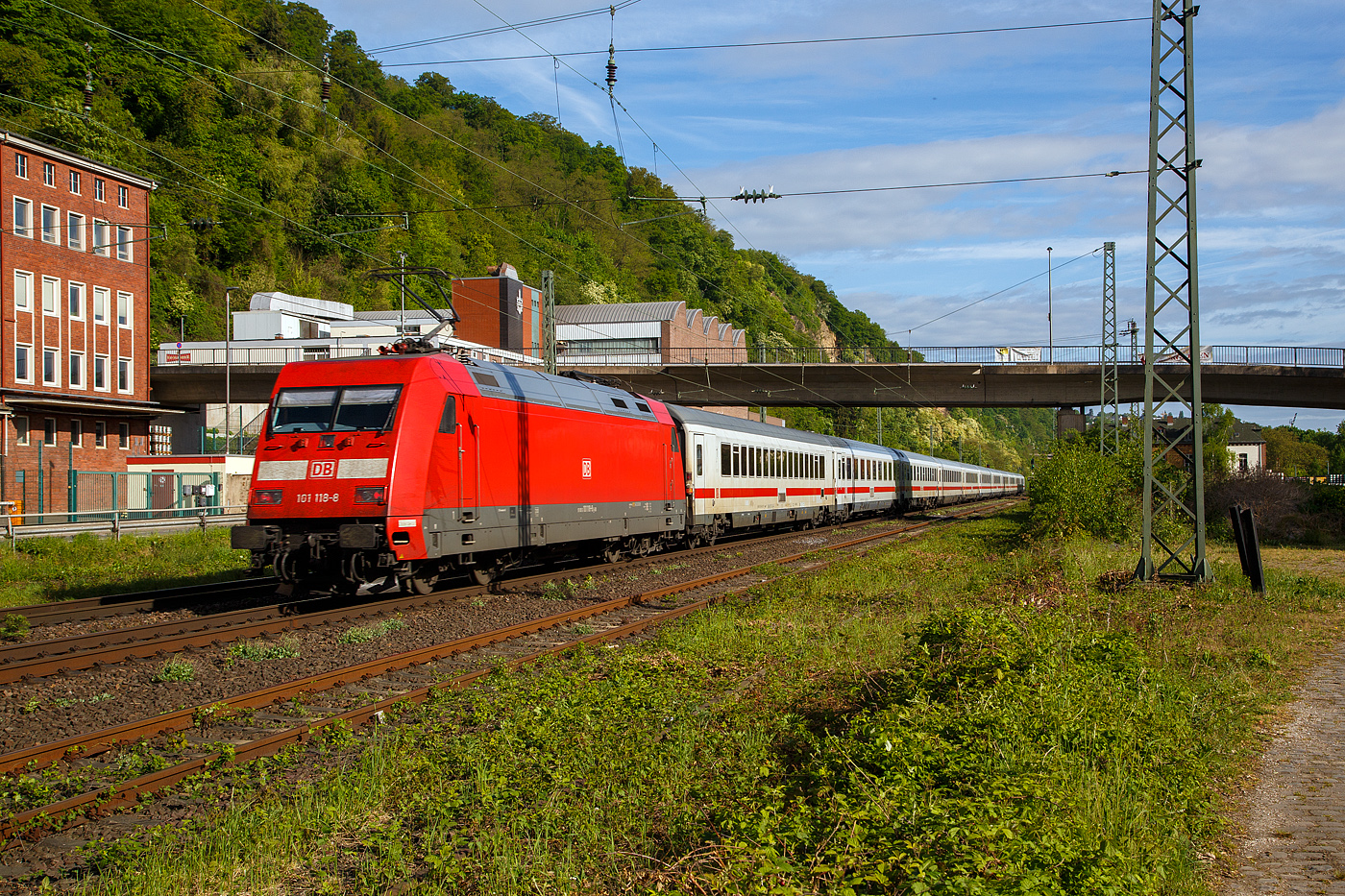 Steuerwagen voraus, geschoben von der 101 118-8, fährt am 28 April 2018 ein IC auf der linken Rheinseite in Richtung Norden und erreicht bald den Hbf Koblenz. Hier passiert er gerade die Koblenzer Brauerei (ex Königsbacher).