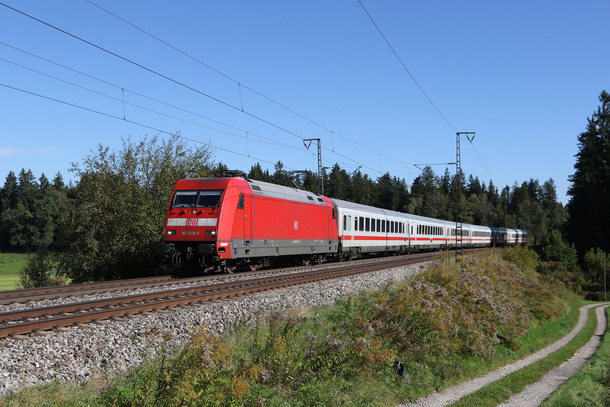101 001 mit einem "Rheingold" auf dem Weg nach Salzburg. Aufgenommen am 31. August 2025 bei Übersee am Chiemsee.
