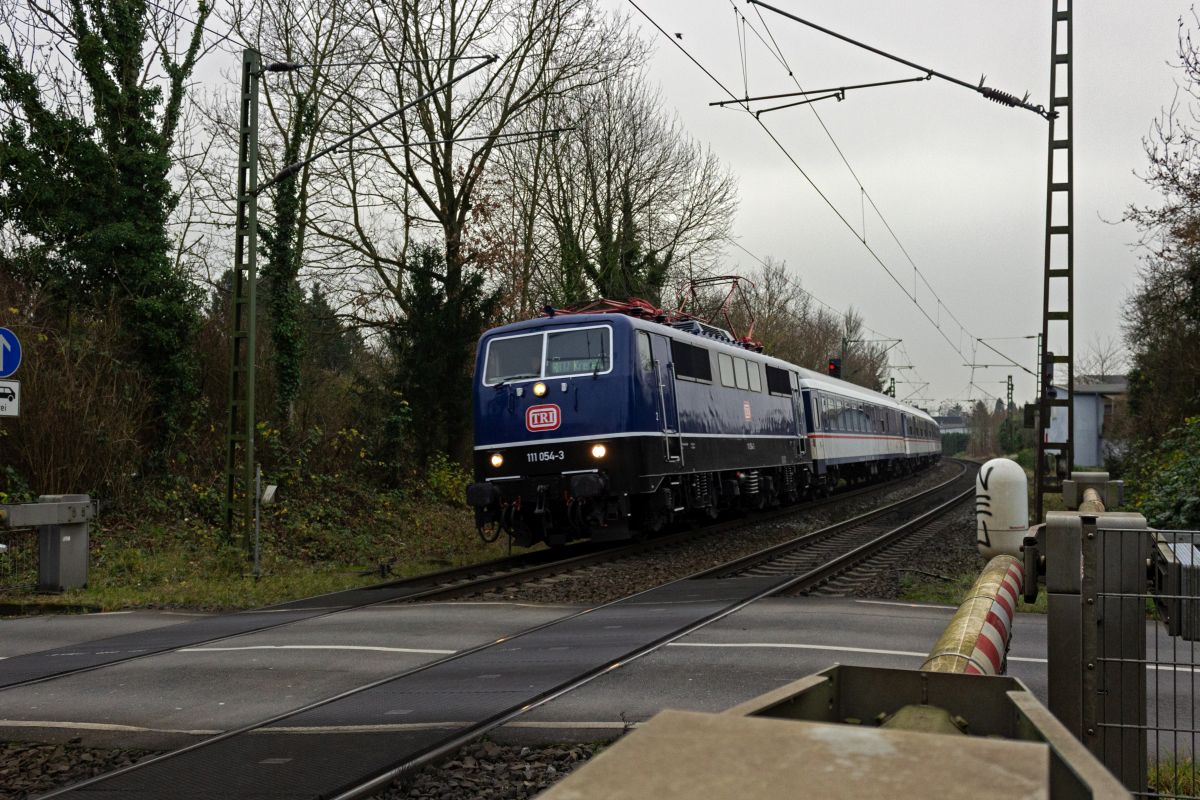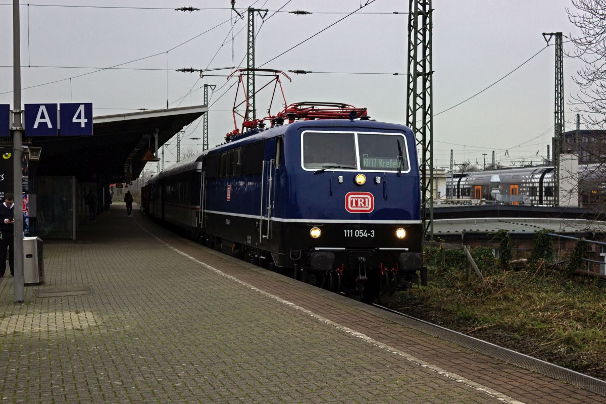 Der Verkehrsverbund Rhein-Ruhr hat recht kurzfristig mit der Linie RB 37 eine neue Verbindung zwischen Neuss und Krefeld eingeführt, für die kein modernes Rollmaterial zur Verfügung steht, sodass eine Garnitur aus drei n-Wagen der Firma TRI auf dieser Strecke pendelt, die im Laufe der Zeit von verschiedenen Lokomotiven bespannt wurden. Ende 2024 war 111 054 auf der Linie eingesetzt, die ein farblich passendes Bild zu den blau/weißen Wagen abgibt.