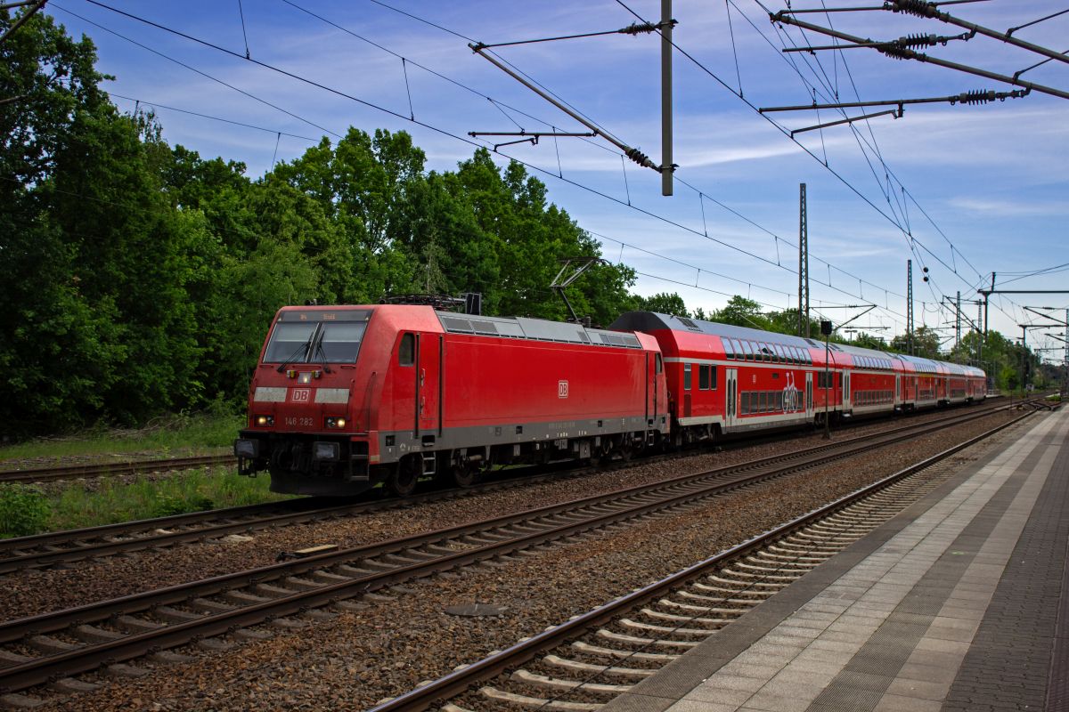 Auf der Fahrt nach Stendal verlässt 146 282 mit einem Zug der Linie RE4 den Bahnhof Ludwigsfelde.