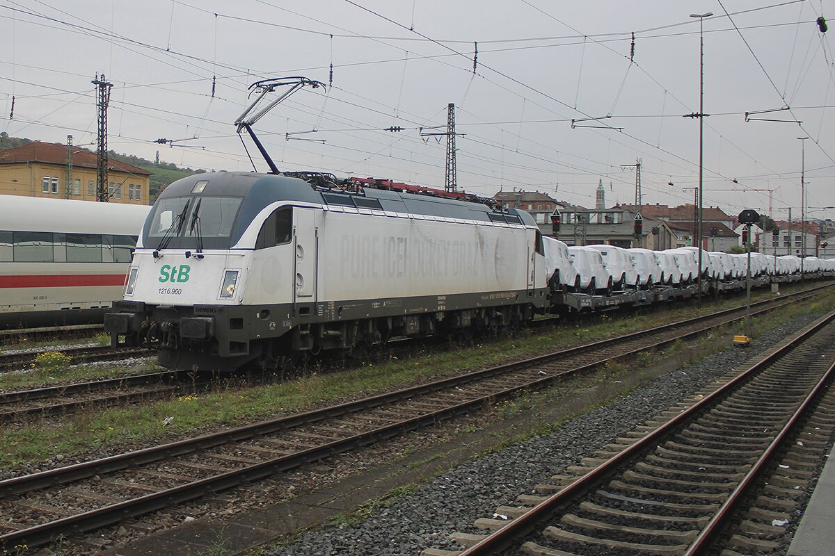 In ozeanblau/beige, die 181 213-0 (91 80 6181 213-0 D-SEL), ex DB 181 213-0 „Saar“ fährt am 24.11.2022 mit einem leeren Autotransportzug der serbischen Milsped AML (2 x2 achsige Wageneinheiten der Gattung Laaers, eingestellt mit B-MIL in Belgien) durch den Hauptbahnhof Regensburg, vermutlich in Richtung Straubing bzw. Passau.