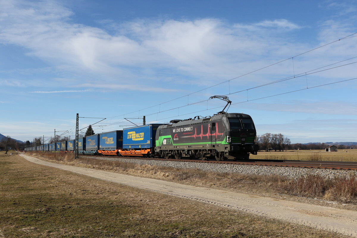 193 240 war am 2. April 2017 bei Übersee mit einem Kesselwagenzug in Richtung München unterwegs.