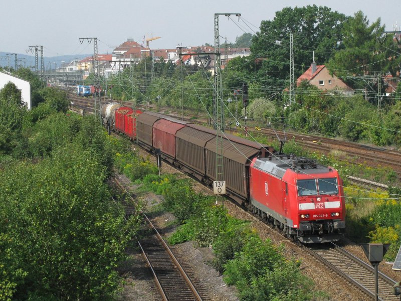 185 042 mit einem Güterzug am 28.08.2008 in Regensburg.