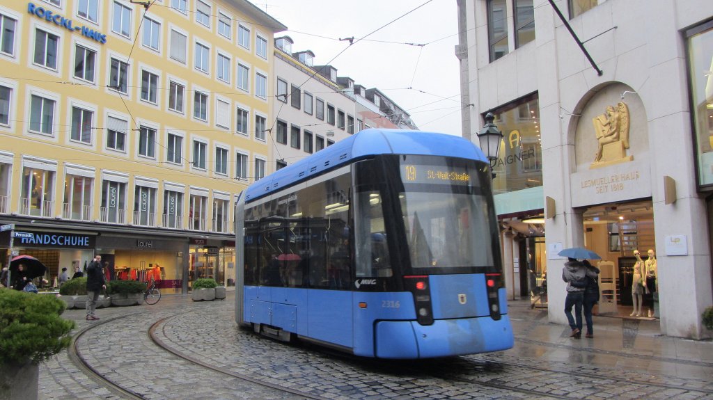 2316 der MVG am 4. Jänner 2013 unterwegs auf der Linie 19 nach St. Veit-Straße in München.