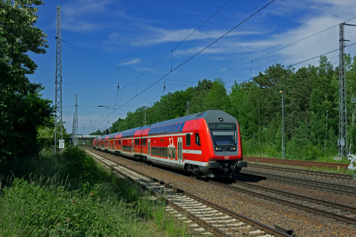Der RE1 mit insgesamt sechs Doppelstockwagen auf dem Weg nach Aachen. Am 4.9.19 scheibt 146 260 den Zug quer durch NRW.