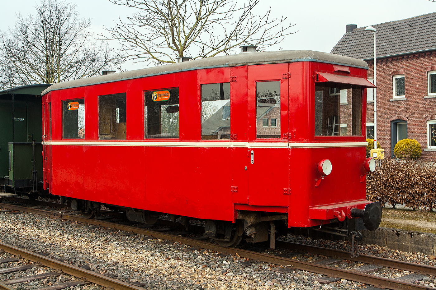 Der zweiachsige meterspurige Personenwagen der Gattung Bi (ex Ci), ex MEG 56 (Mittelbadischen Eisenbahnen AG), am 31 März 2013 beim Kleinbahnmuseum Selfkantbahn der IHS - Interessengemeinschaft Historischer Schienenverkehr e. V. in Schierwaldenrath.