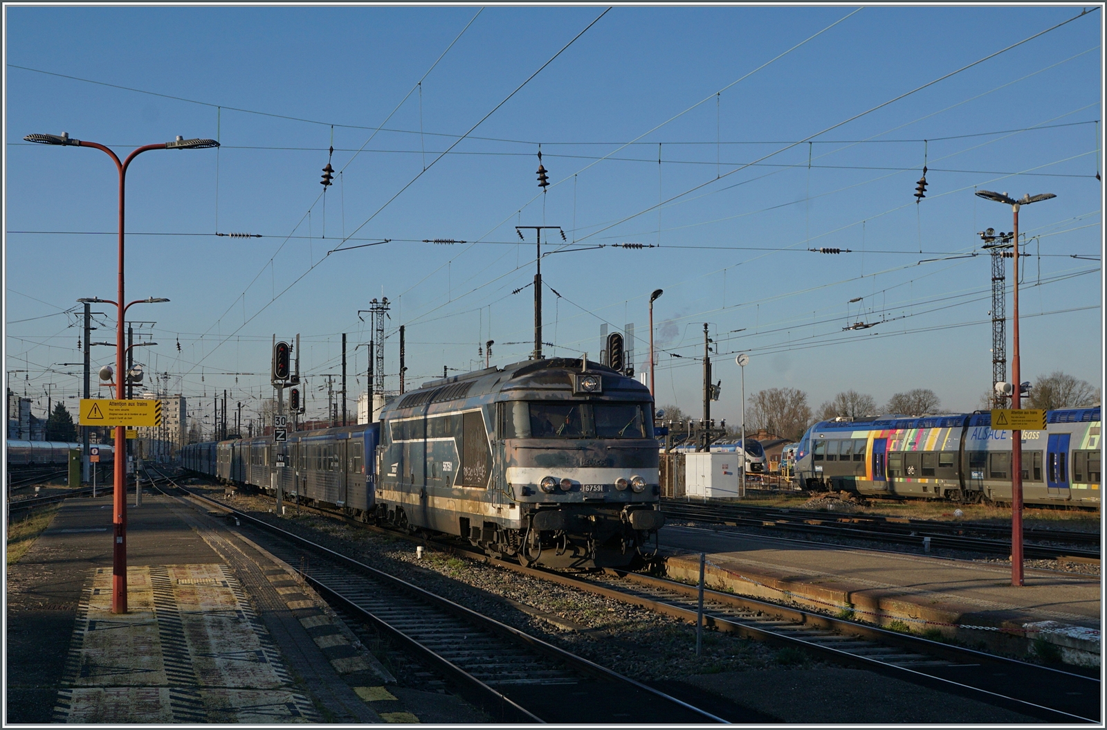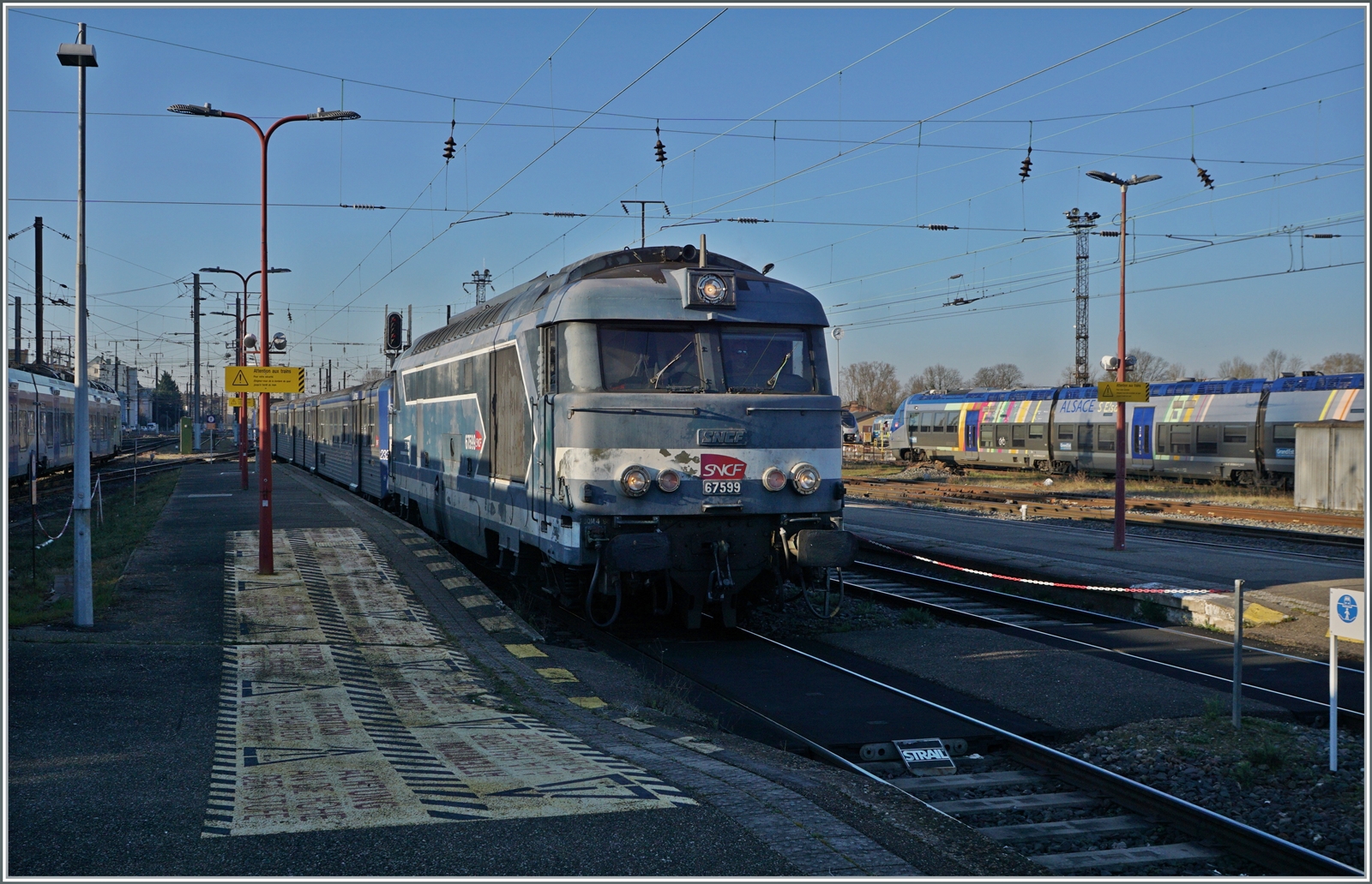 Text und Bild sind schon bekannt, nur die Lok ist diesmal eine andere: in Strasbourg kommt die SNCF BB 67591 aus dem Dépôt gefahren während im Hintergrund noch knapp die SNCF BB 67511 zu erkennen ist.