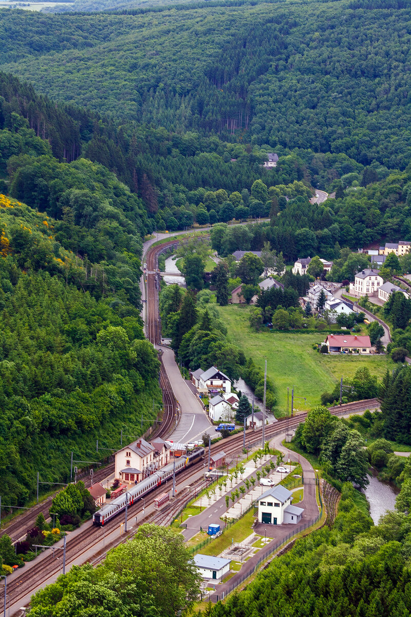 Blick von der Hockslay, die CFL 3006 erreicht am 15 Juni 2013 mit belgischen I11 Reisezugwagen als IR von Luxembourg über Troisvierges und Liège (Lüttich) nach Liers(B) den Bahnhof Kautenbach (Kautebaach) an der Nordstrecke (Linie 10).