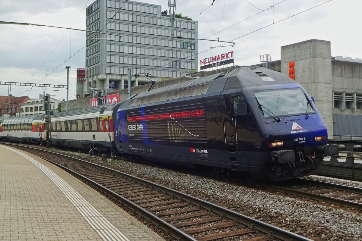 Die Suche nach einem besseren Fotostelle für die neue Rhonebrücke führten mich an Nahe an den sicheren Abgrund; doch von dort hat man eine schönen Blick auf die Brücke und die Rhone-Eben des Chablais. Im Hinterrund ist Monthey zu erkennen, in der Bildmitte liegt Massongex und auch die Fahrplanfeld Strecke 130 (St-Maurice - St-Gingolph) ist zu sehen. Das Gebiet rechts der Rohne gehört bereits zum Kanton Waadt, welches eine Re 460 mit dem IR 1816 von Brig nach Genève gerade erreicht hat. 26. August 2016