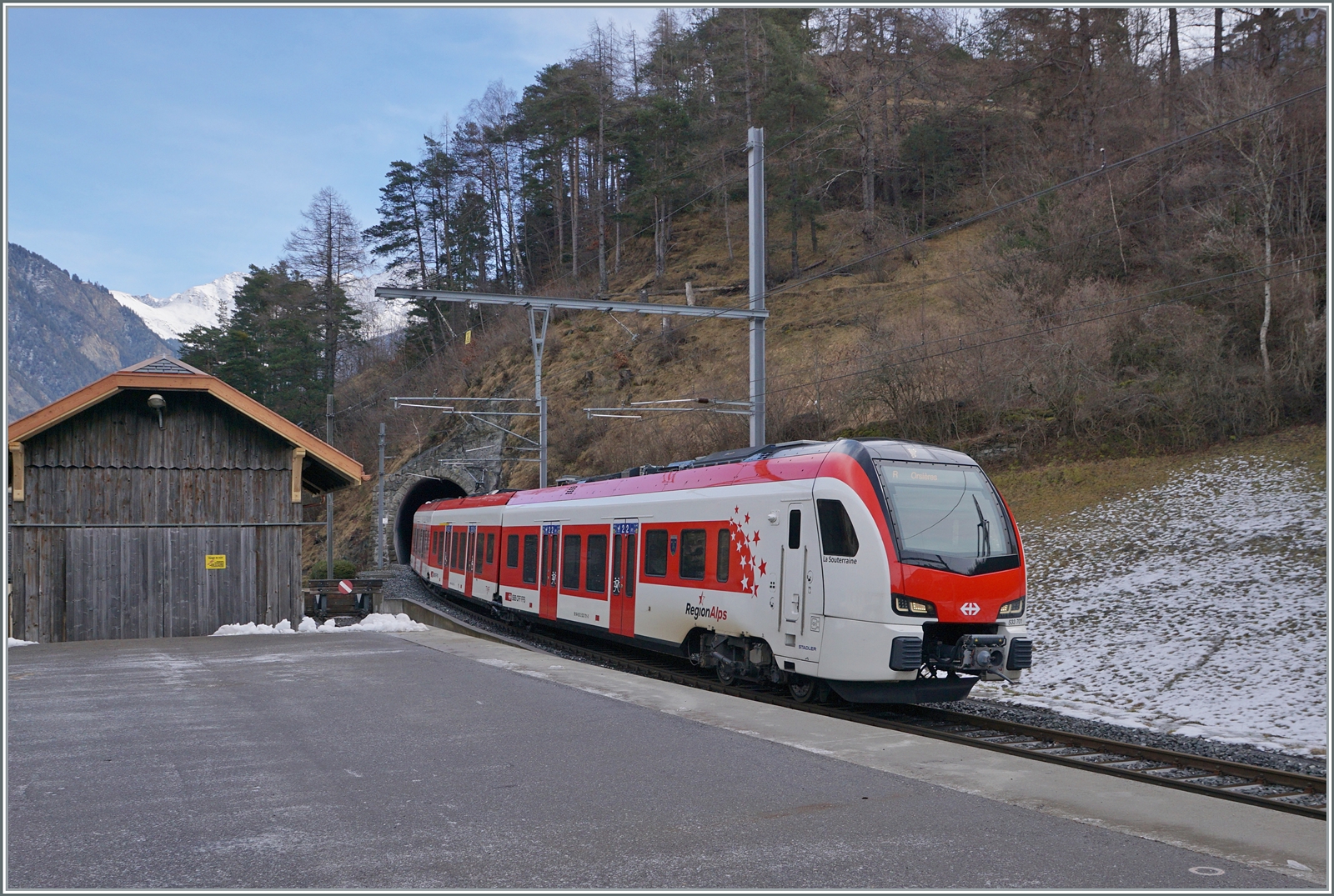 SBB KISS in ungewohnter Umgebung: Der SBB RABe 511 110 hat sein Ziel Le Châble als IR 1745 "Verbier Express" erreicht und wartet nun auf die spätnachmittägliche Rückfahrt als RE 18496 nach Genève, wobei der Zug ohne Halt zwischen Martigny und Vevey verkehrt und dort mit dem RE 18460 vereinigt wird.