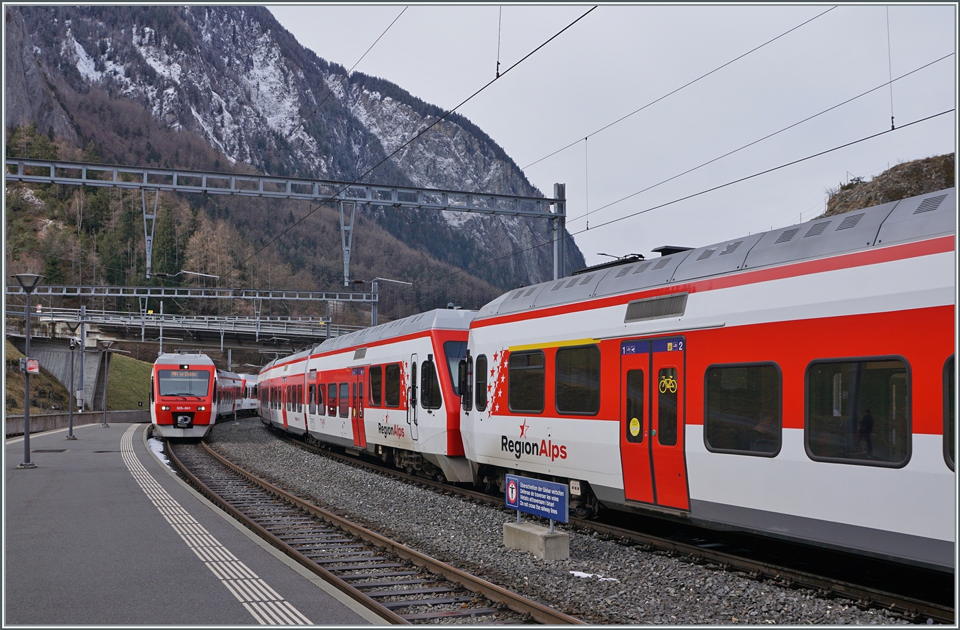 Rechts im Bild der TMR Region Alps RAe 525 039 (NINA) welcher auf die baldige Abfahrt nach Martigny wartet.