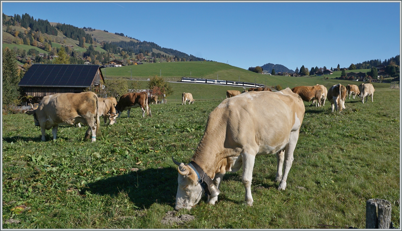 Der MOB Alpina ABe 4/4 93.01 und ein weiterer sind bei Planchamp mit dem MOB Belle Epoque Zug von Zweisimmen nach Montreux unterwegs.