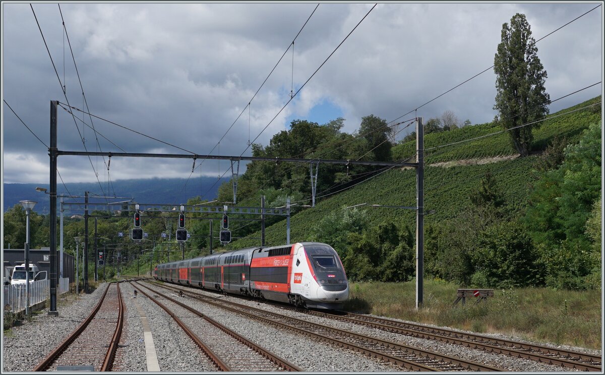 Lausanne mit zwei Zügen nach Frankreich: Der SBB RABe 511 030 ist als RE 33 auf der Fahrt nach Annemasse und der TGV Lyria nach Paris. Zwar ist die Grenze von hier nur rund sechs Kilometer entfernt in der Mitte des Genfer Sees, doch doch beide Züge werden die Schweiz erst nach Genève, gut 70 Km von hier verlassen.
