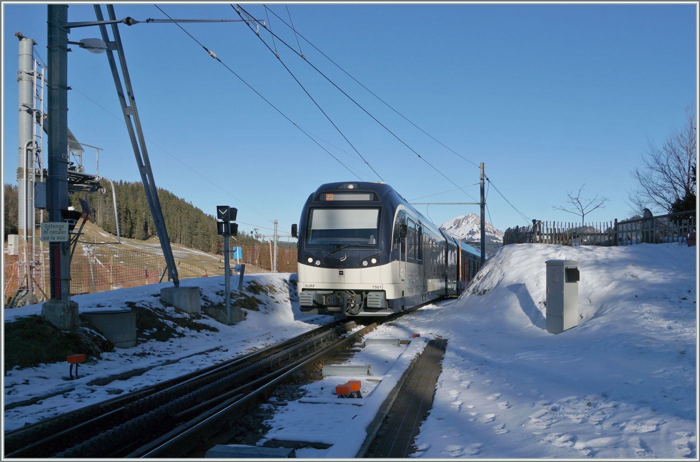 Während links im Bild ein SBB RABe 523 als Regionalzug Vevey in Richtung Aigle verlässt, wartet im Hintergrund ein CEV MVR ABeh 2/6 auf seinen nächsten Einsatz.
