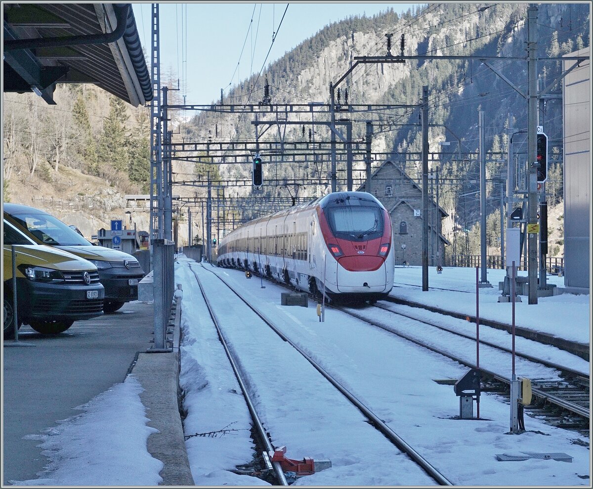Das Besondere an diesem nicht gerade gelungen Bild sieht man erst auf den zweiten Blick: Es sind ZWEI Züge zu sehen. Auf der untern Ebene ist ein SBB RABe 501 Giruno auf dem Weg Richtung Arth Goldau und auf der mittlerne Ebene ein SOB RABe 526 "Traverso" auf dem Weg nach Locarno.