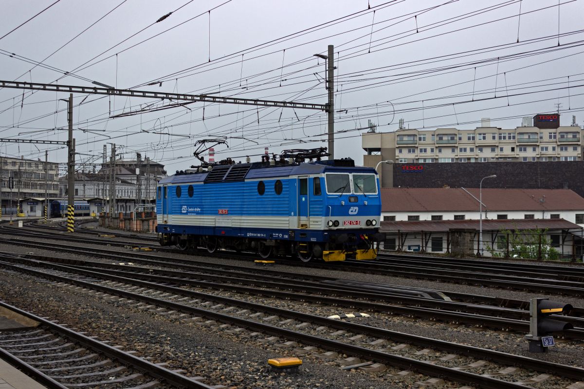 362 082 und 363 038 stehen am Abend des 29.10.2011 in Plzen. Sichtungsbild aus dem fahrenden Zug.