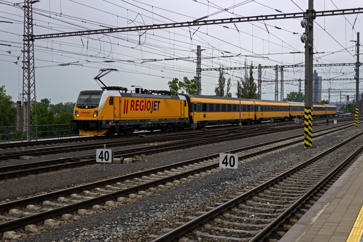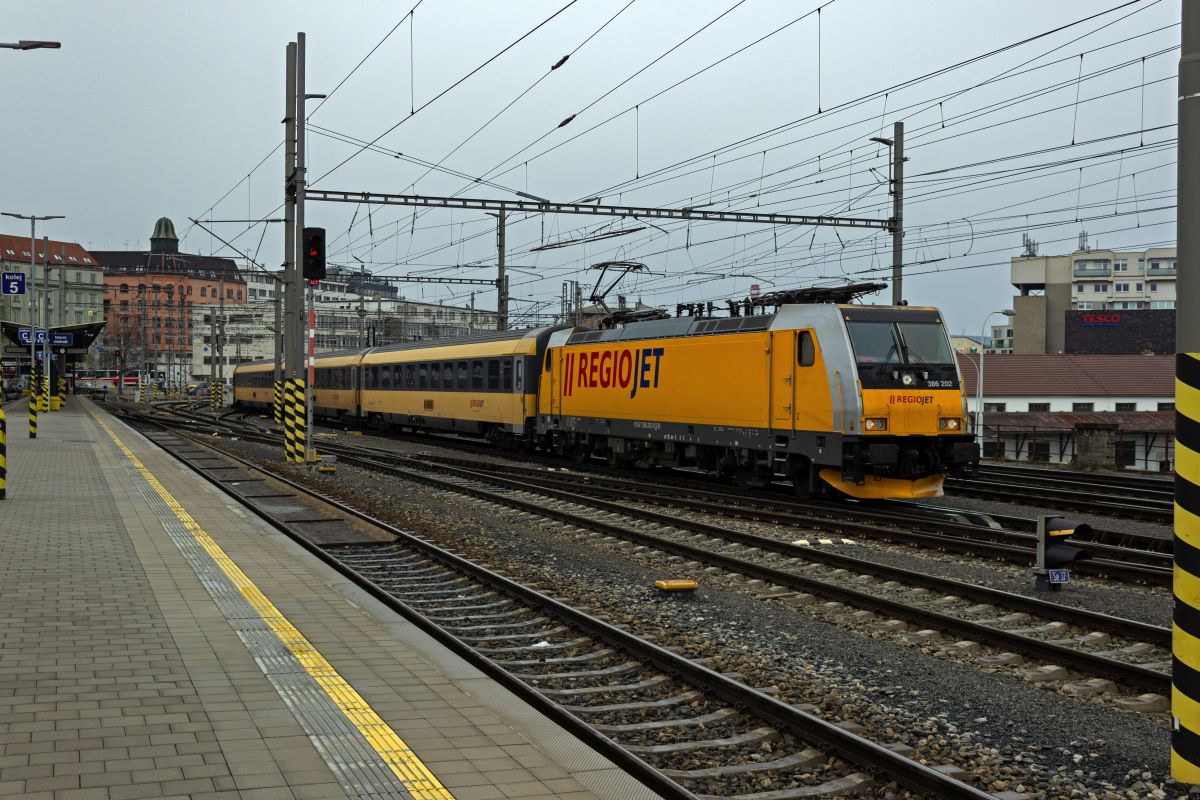 386 202 verlässt am 24.04.24 mit dem RegioJet 1035, der über Wien nach Budapest unterwegs ist, Brno.