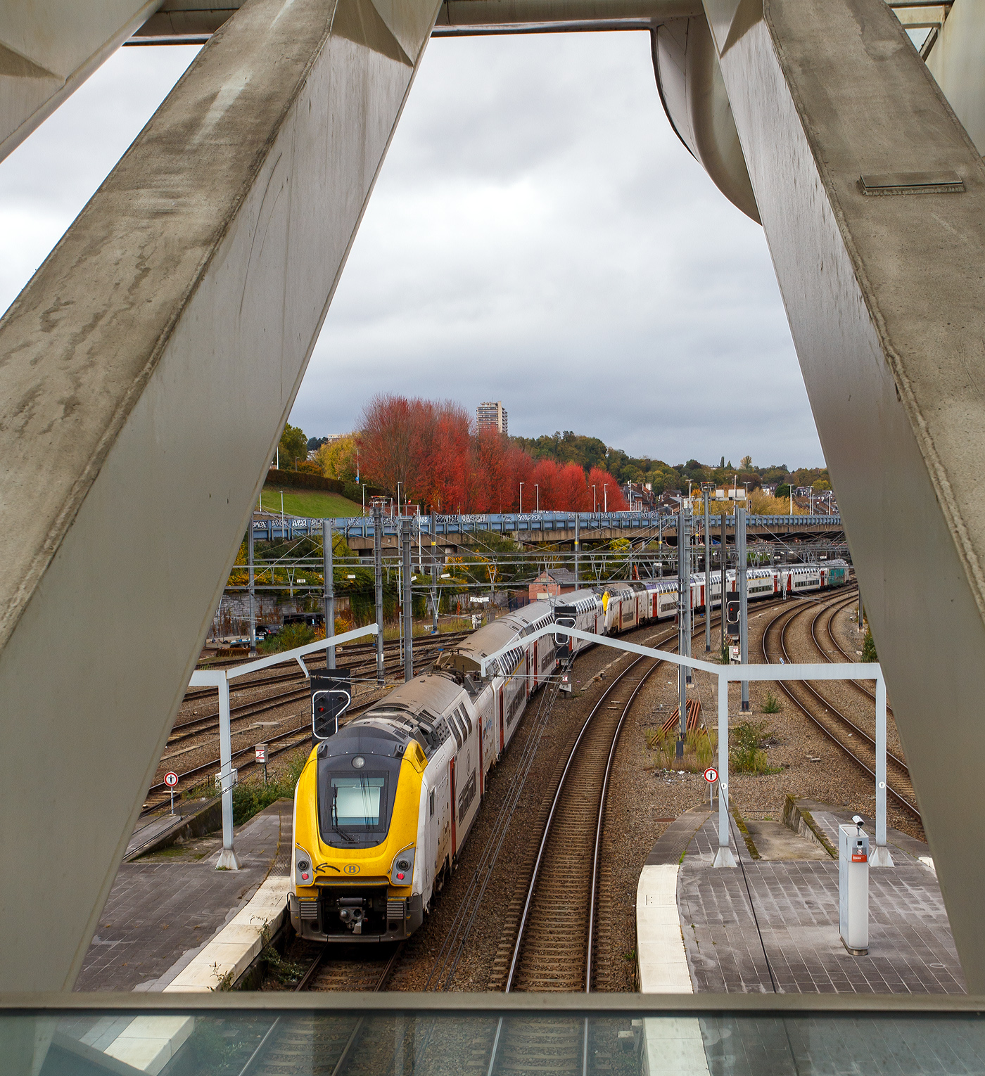 Die Gumminase SNCB/NMBS Triebzug AM 96 - 535 (AM = Automotrice), ein 3 kV Einsystemtriebzug mit GTO-Traktionsstromrichter am 21 Oktober 2025 im Bahnhof Liège Guillemins (Lüttich-Guillemins). Er fährt als S-Zug Lüttich (Train S Liège) der Linie S 42, die Verbindung (Liers – Herstal – Liège-Saint-Lambert – Liège-Guillemins –Seraing – Flémalle-Haute).