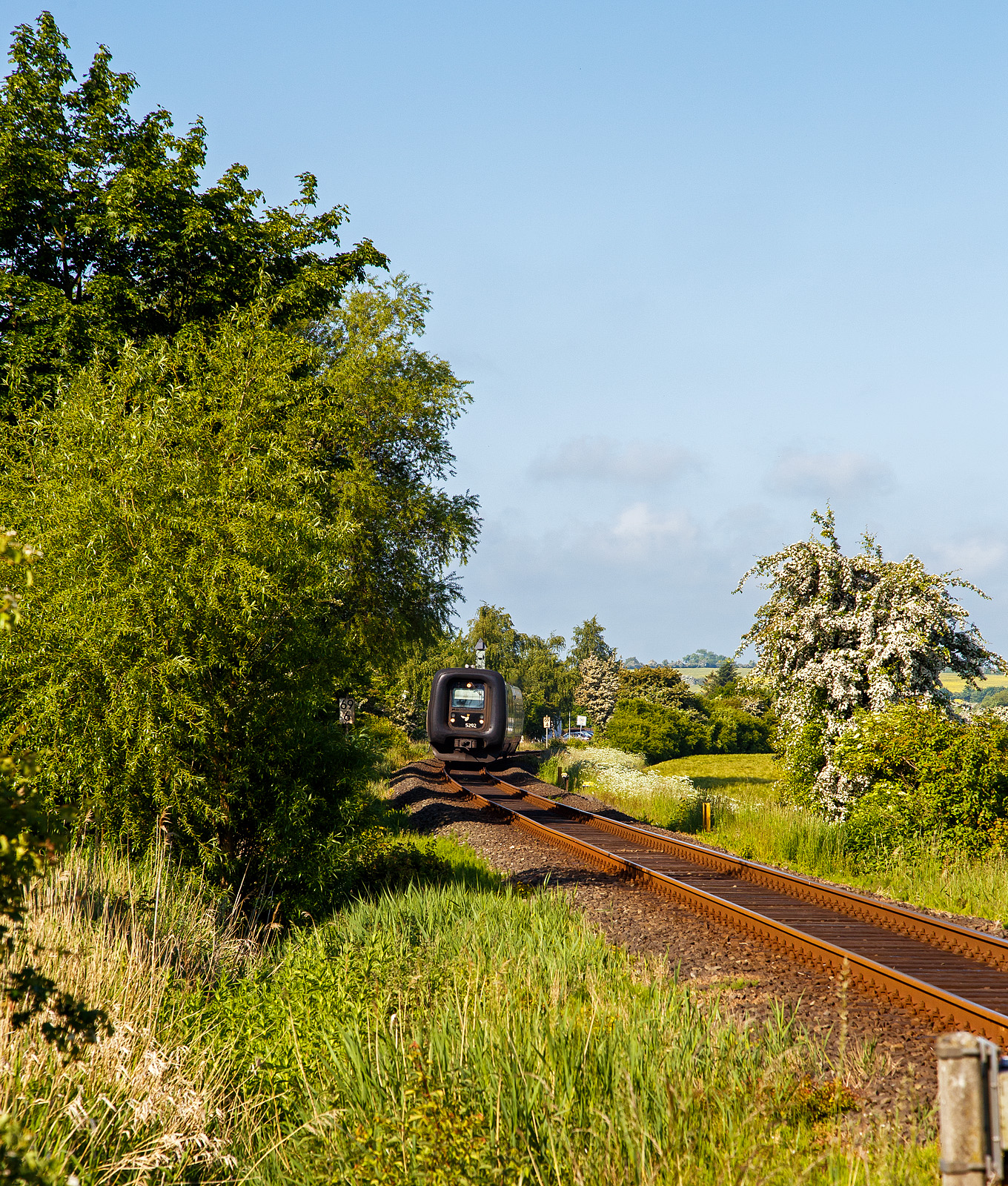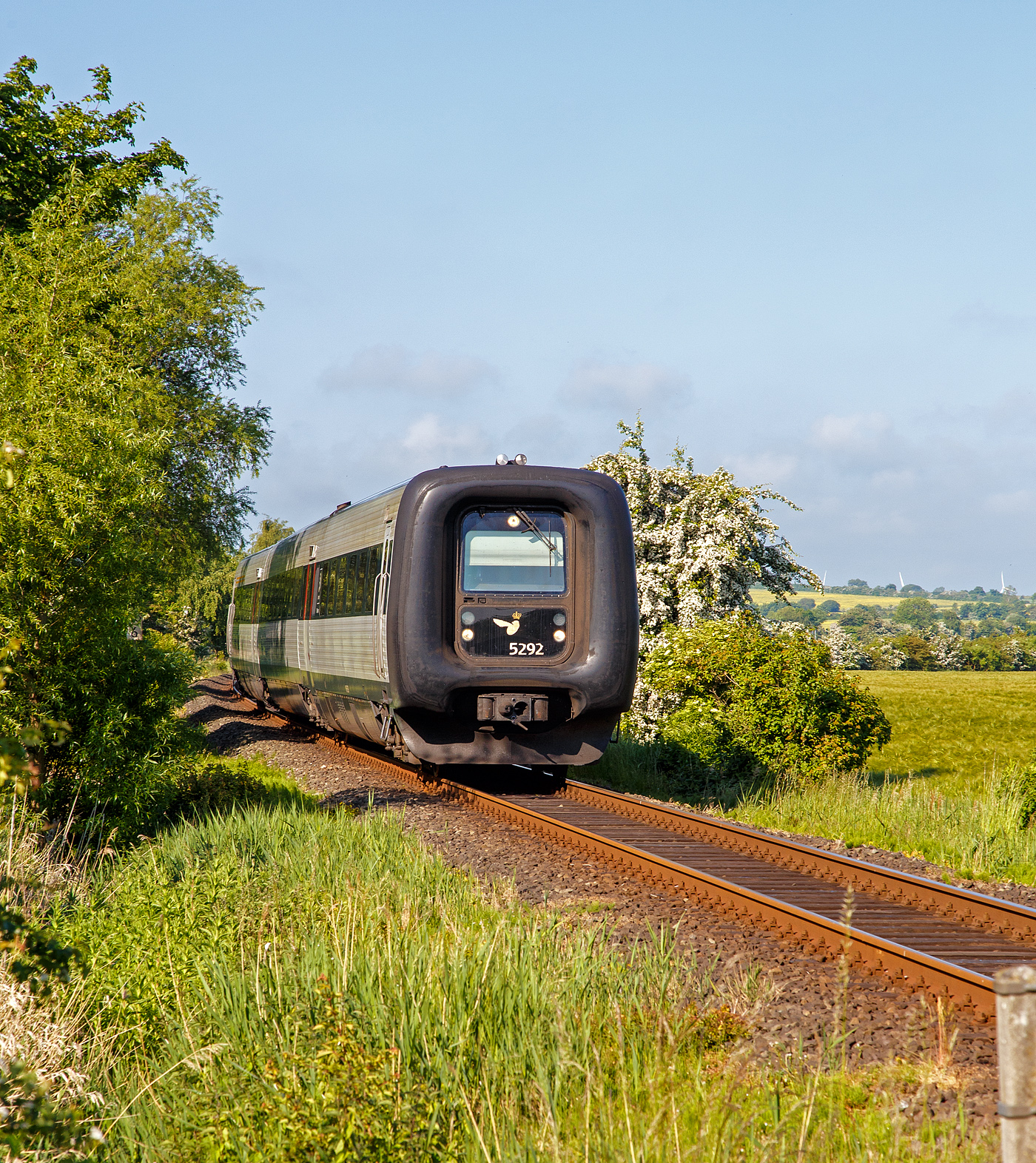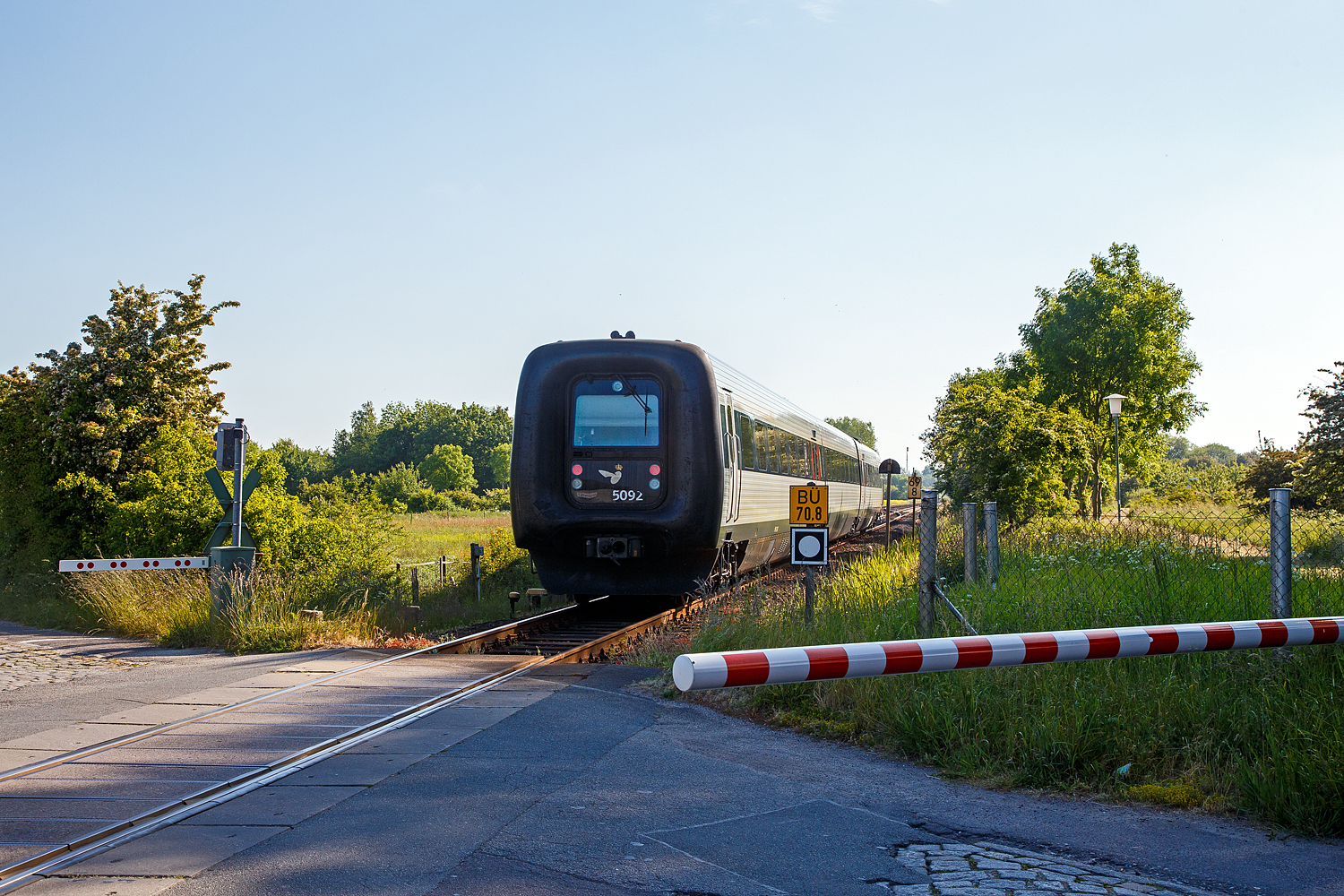Die Gumminase bzw. der DSB IC 3 – MFB 5292 / FF 5492 / MFA 5092 fährt am 12.06.2015 als EC 31 (Hamburg - Lübeck - Puttgarten - Rödby - Kopenhagen), hier auf der „Vogelfluglinie“ beim Bü 69,8 der Bahnstrecke Lübeck–Puttgarten (KBS 141) bei Großenbrode .