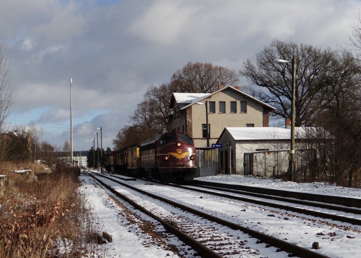 227 004 fuhr am 27.01.14 mit einem Bauzug von Plattling nach Magdeburg, hier zusehen bei der Durchfahrt in Pöllwitz.