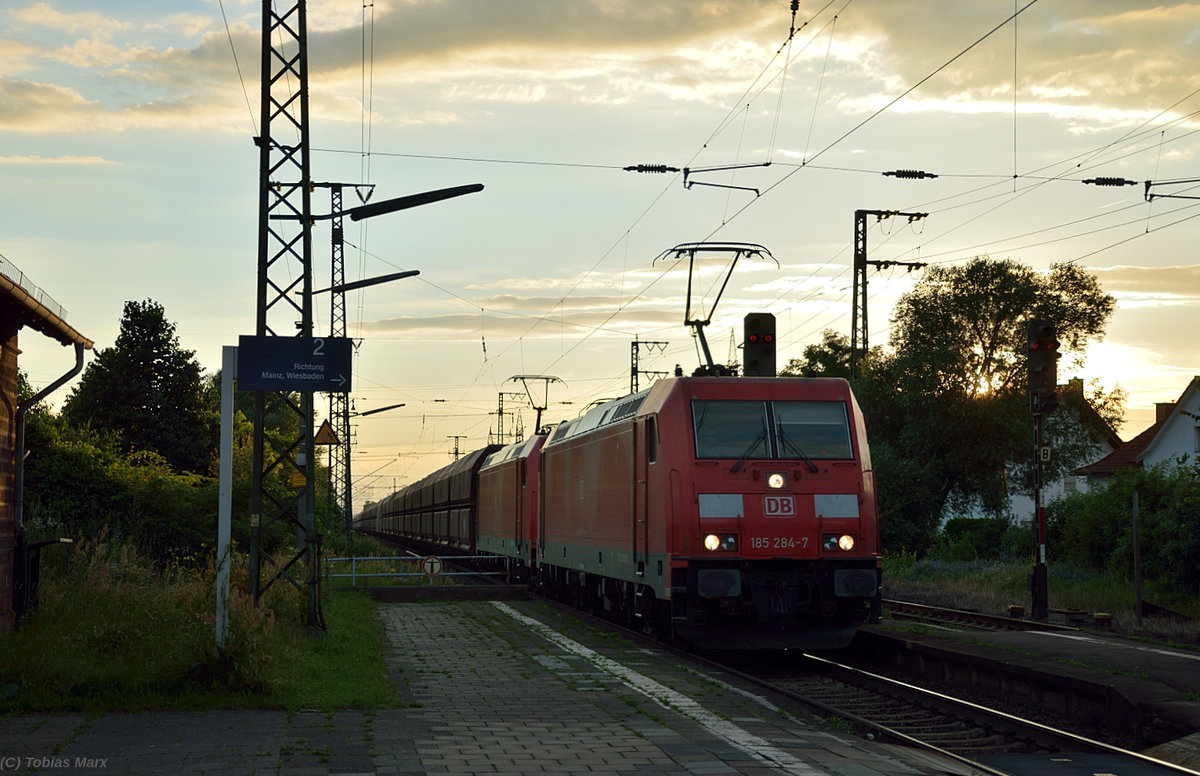 185 284 und 185 xxx bei der Durchfahrt mit einem Kohlezug am 01.07.2016 durch Weiterstadt.