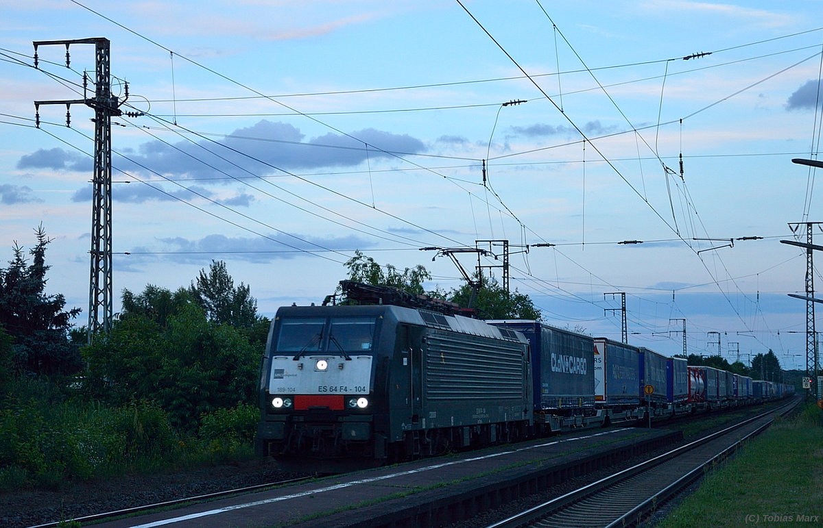189 104 bei der Durchfahrt mit einem Aufliegerzug durch Weiterstadt am 01.07.2016