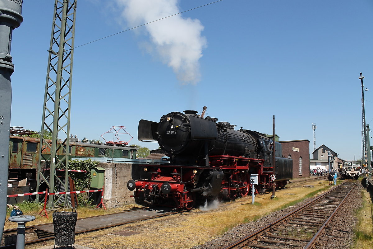 Die ersten Meter der 23 042 unter Dampf im Jahr 2015. Bei den Bahnwelttagen durfte sie zwar noch nicht auf DB-Gleise, aber im Museum stand sie mit 10 Bar unter Dampf. Hier am 14.05.2015
