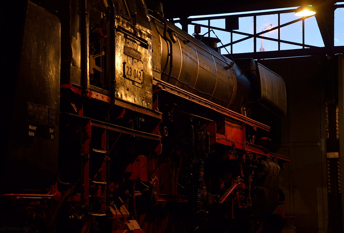 Abendstimmung im Eisenbahnmuseum Darmstadt-Kranichstein. 23 042 steht bei Schuppenbeleuchtung im Lokschuppen im Okt.2016