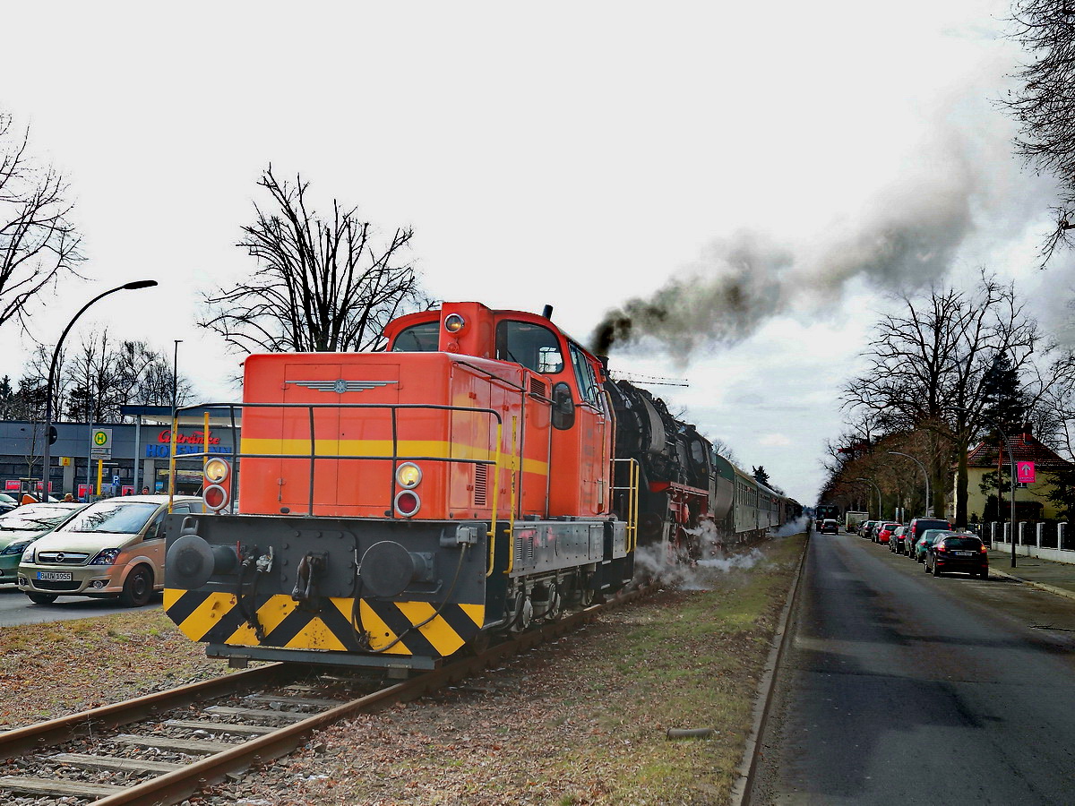 52 8131-6 der WFL und ML 00605 der Neukölln - Mittenwalder Eisenbahn-Gesellschaft AG (NME) in der Stubenrauchstrasse nahe dem Tanklager Rudow in Berlin Rudow am 17. März 2018.