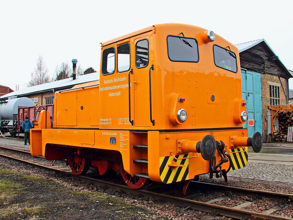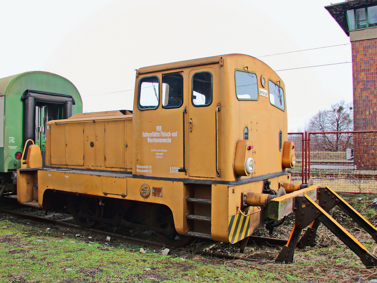 Am 17. Februar 2018 steht in Blankenburg (Harz) abgestellt eine Werkslok.