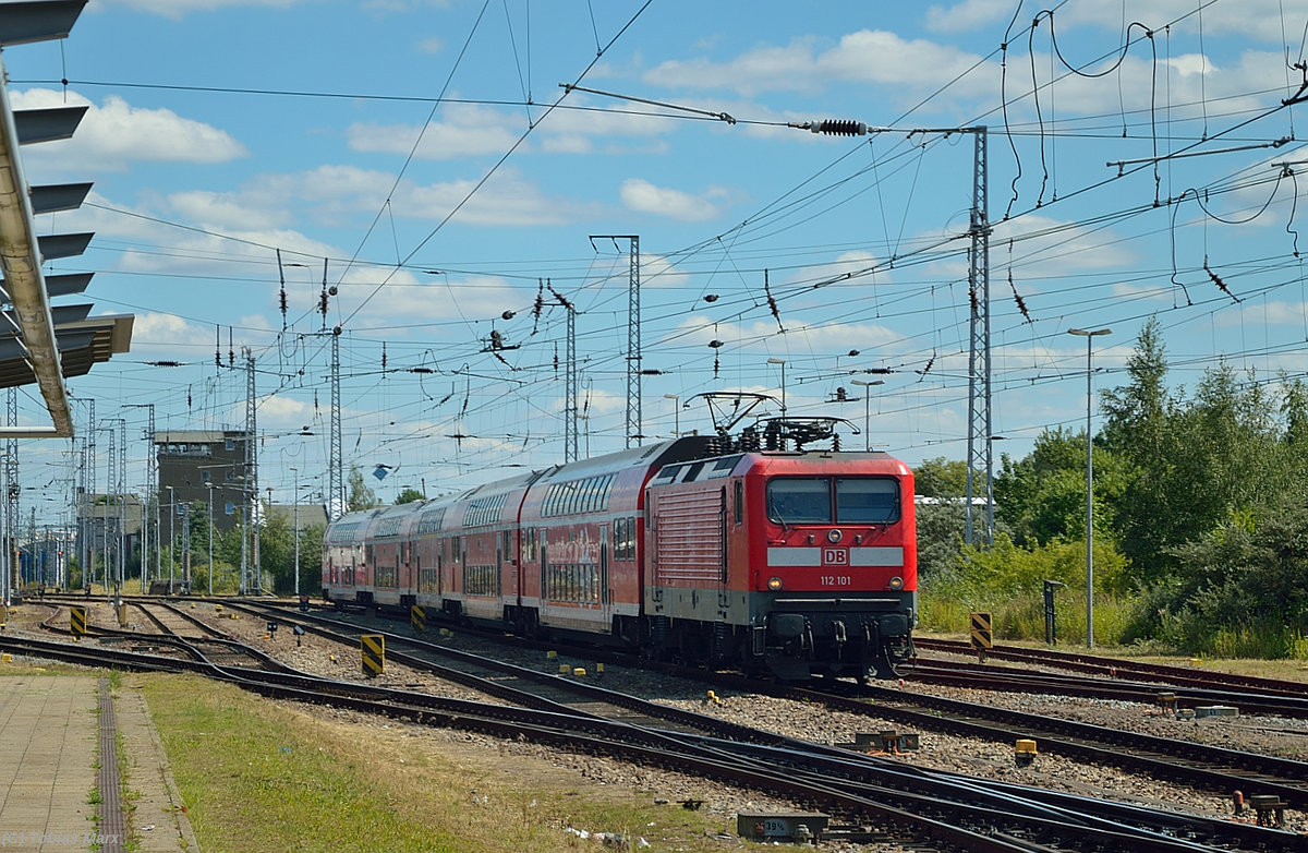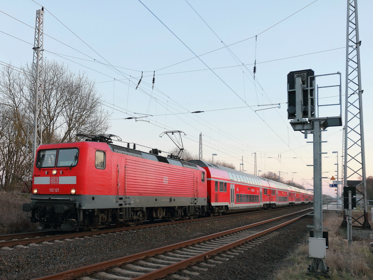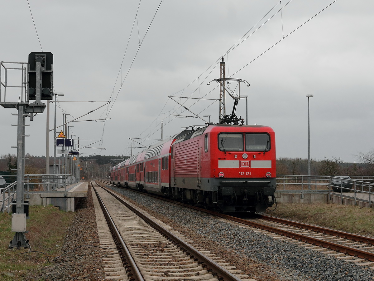 112 121 mit dem RE 3 von Eberswalde (wegen Bauarbeiten in Berlin) nach Stralsund am 19. März 2016 im Haltepunkt Nechlin im Bundesland Brandenburg. Klaus-P. Dietrich