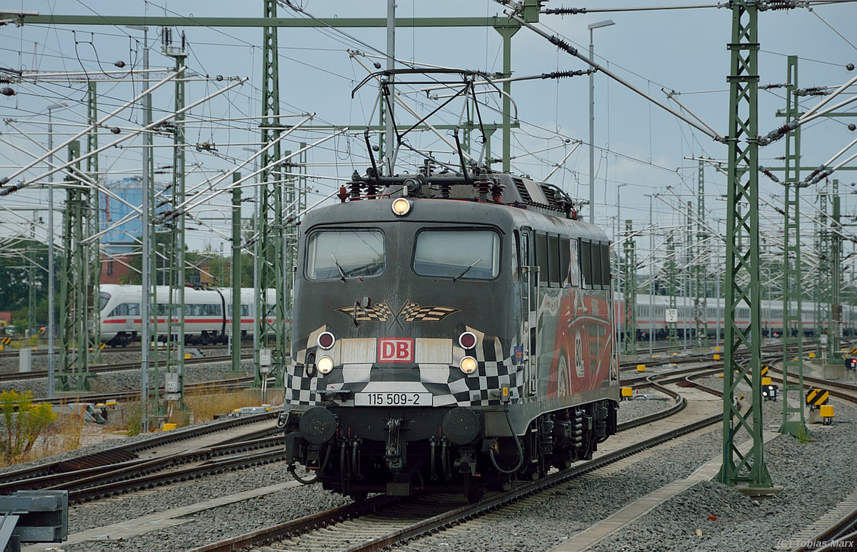 115 198-4 ist gerade mit dem EuroCity im Bahnhof Stralsund Hbf angekommen und wird vom Zug Abgekuppelt am 18.6.13
