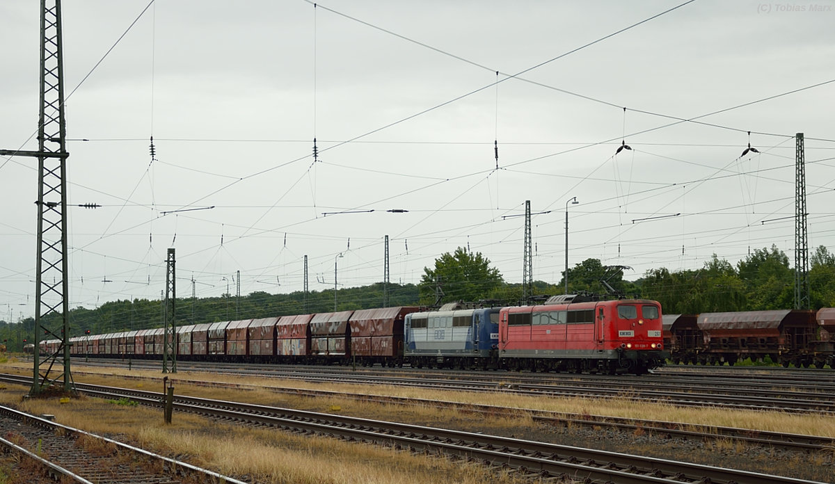 151 038 und 151 151 bei der Durchfahrt durch Darmstadt-Kranichstein am 02.07.2016