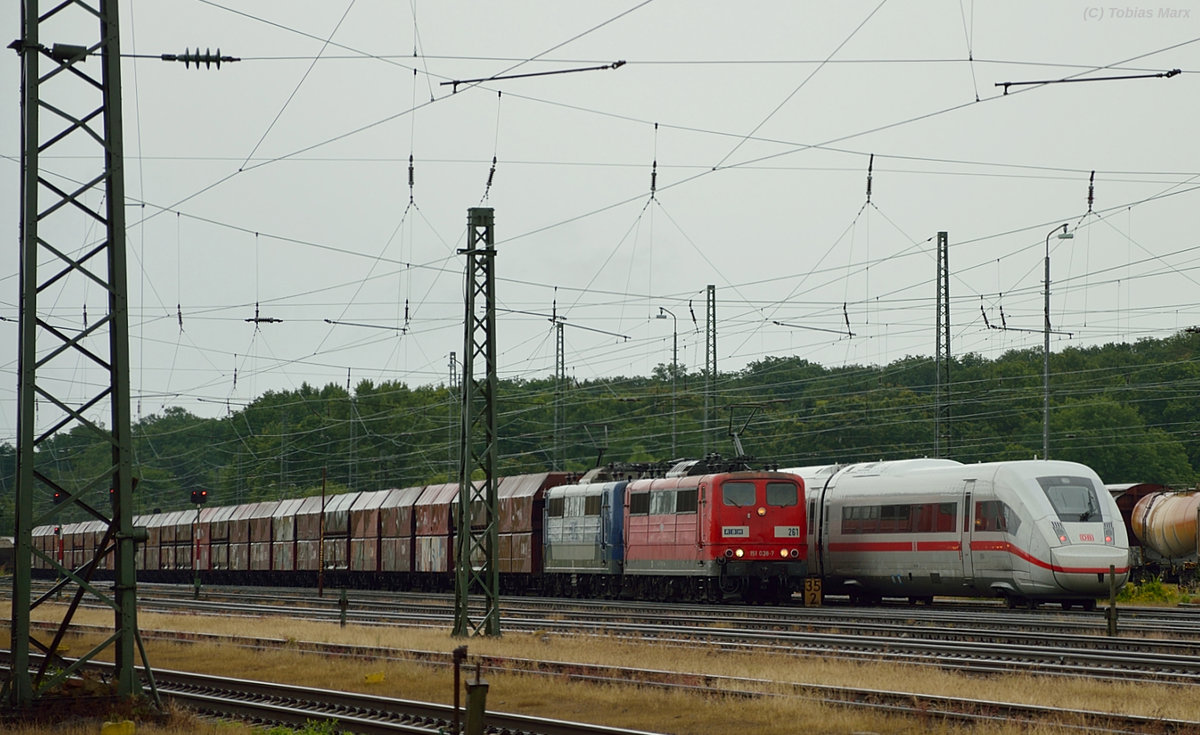 151 038 und 151 151 passieren den ICE 4 am 02.07.2016 in Darmstadt-Kranichstein.