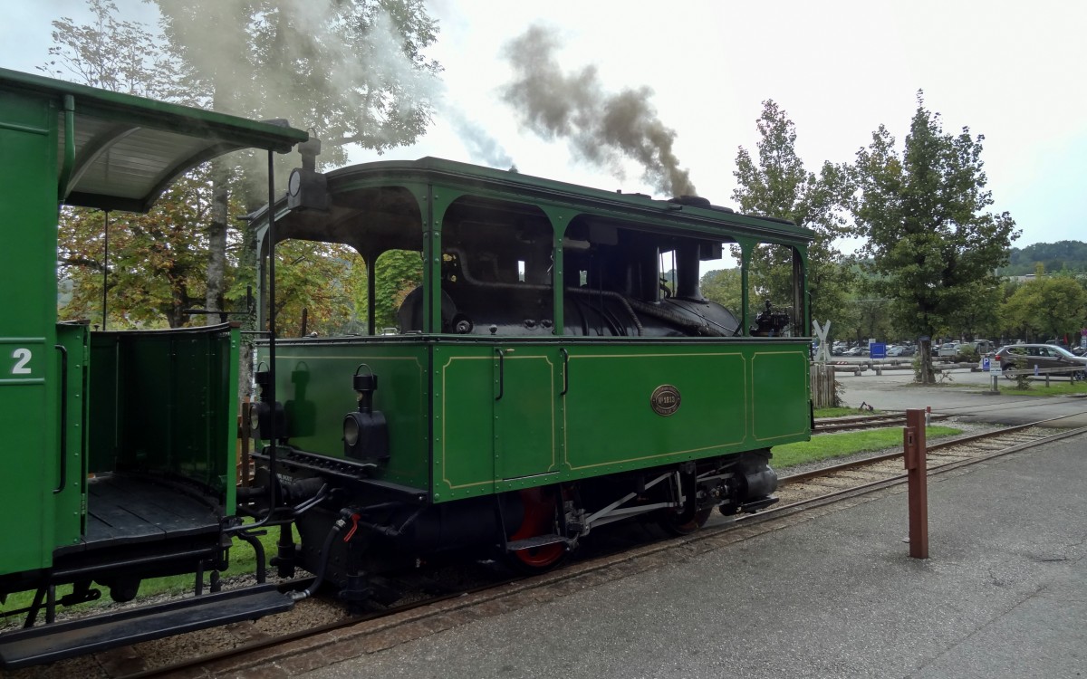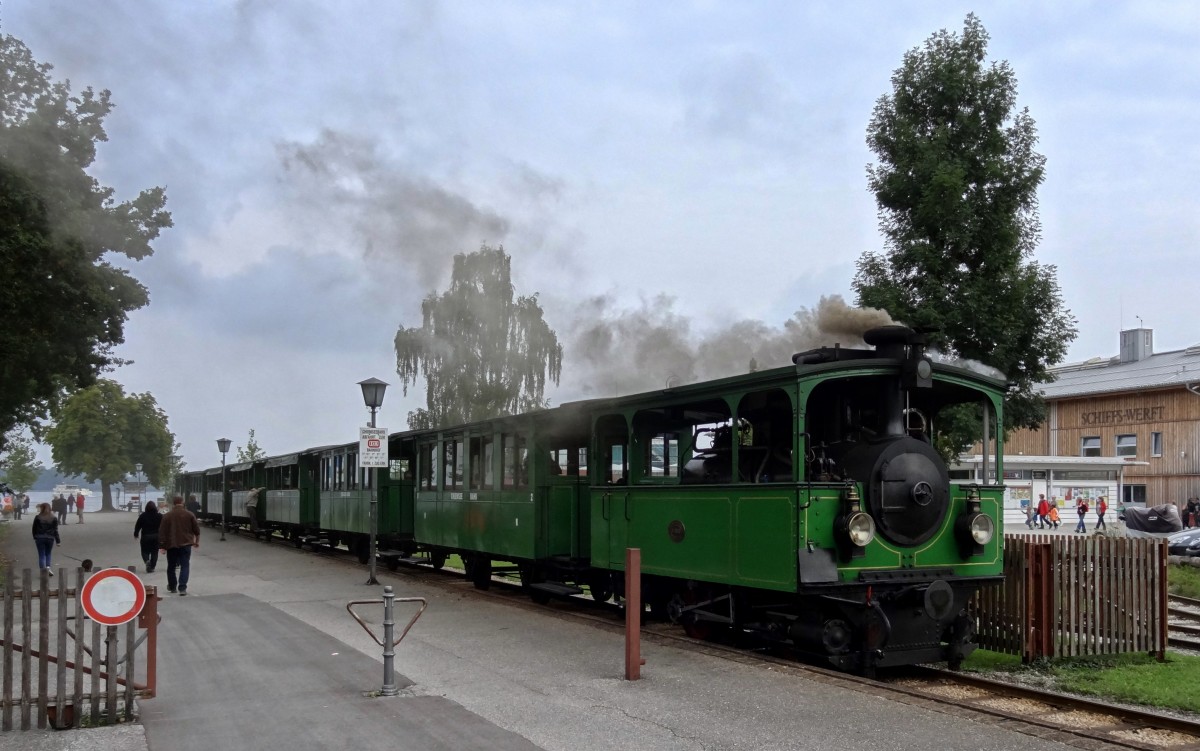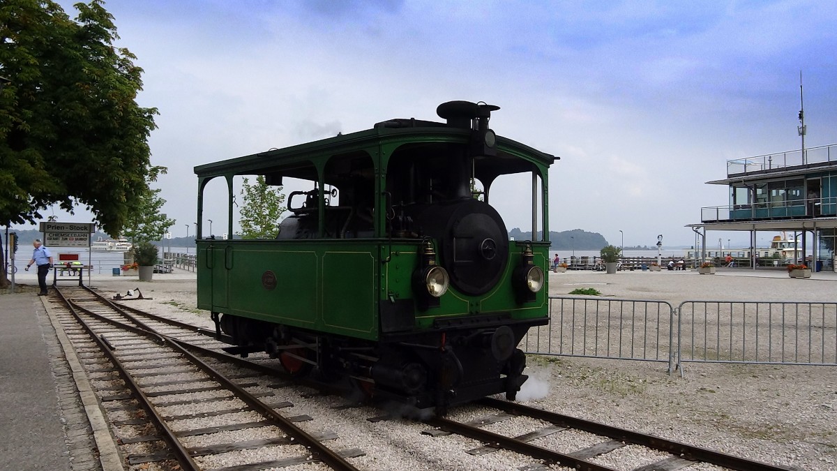 Die kleine Dampflokomotive der Chiemseebahn beim Aufenthalt in Prien-Stock. Aufgenommen im September 2014.