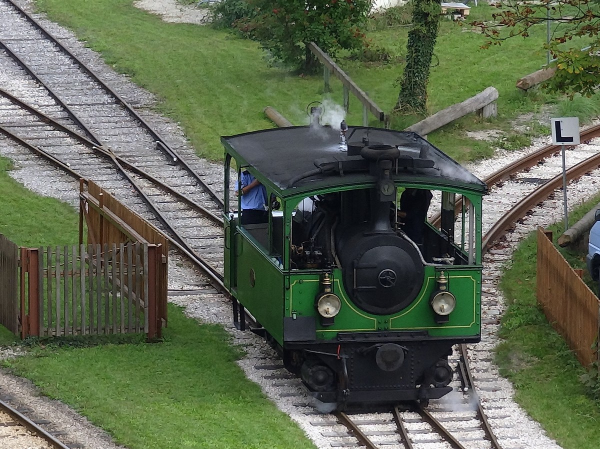 Die kleine Dampflokomotive der Chiemseebahn beim Umsetzen im Bahnhof Prien-Stock. Aufgenommen im September 2014.