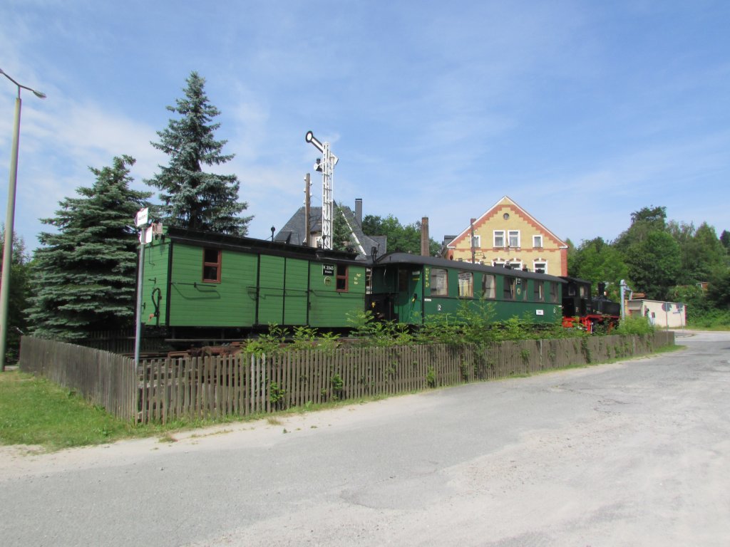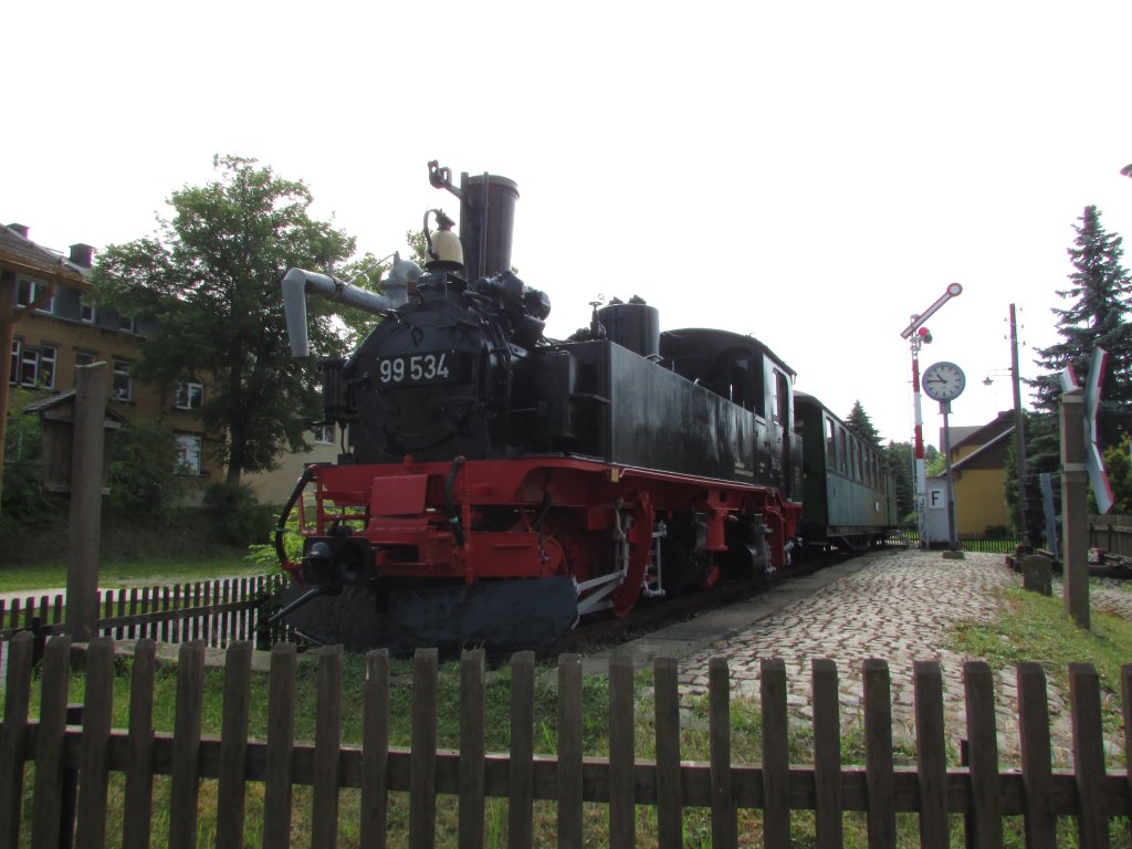 99 534 steht mit ihrem Zug am ehemaligen Bahnsteig von Geyer am 17.Juli.2013