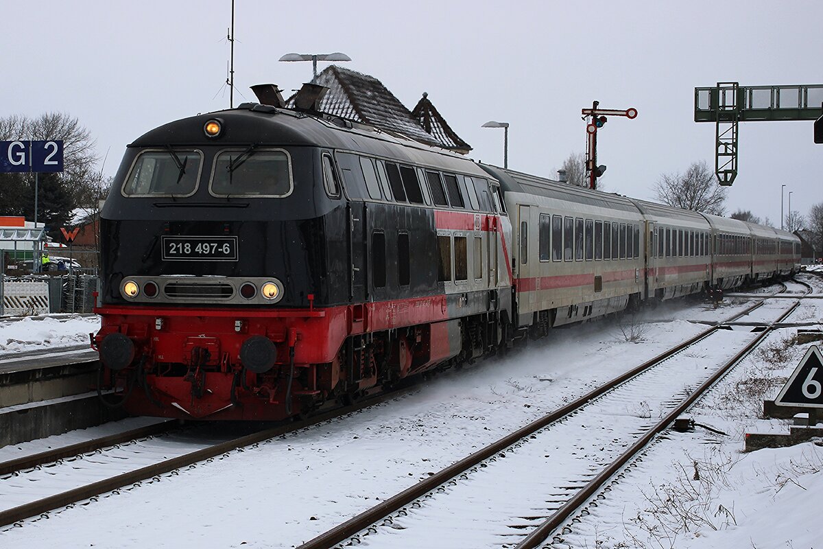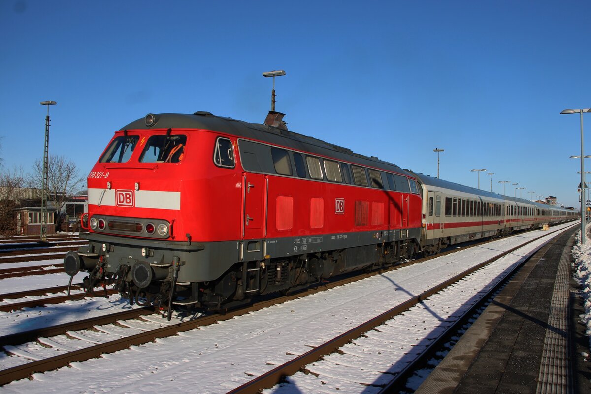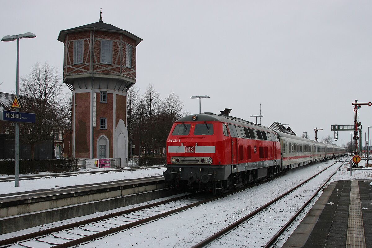 Am Nachmittag von 14 Februar 2026 zieht 218 321 der IC 2375 aus Niebüll nach Itzehoe, wo einer 101er den Diesellok ersetzen wird.