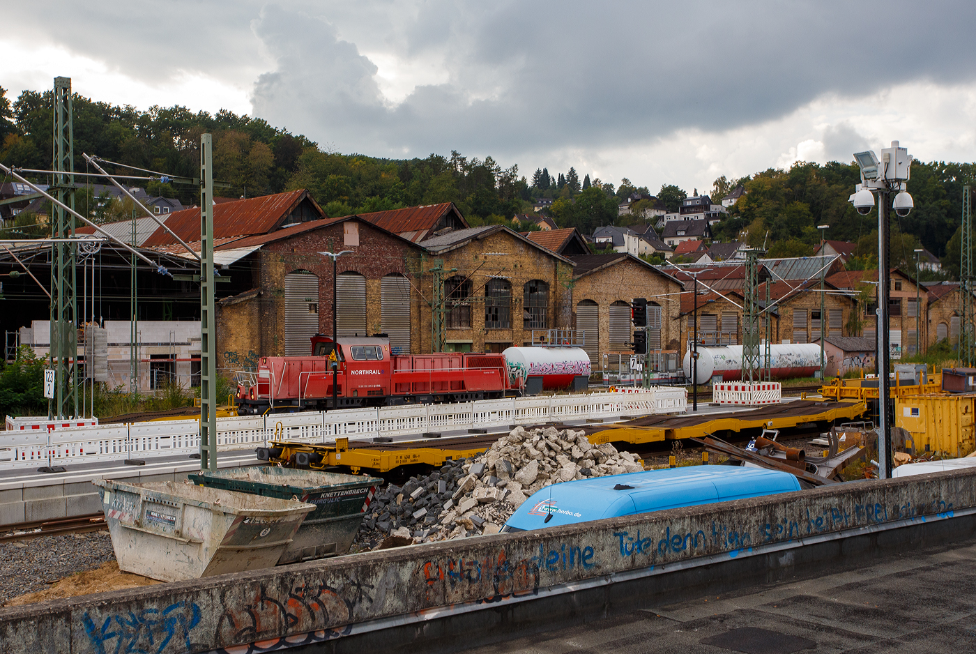 Hinten am Gleis 105 rangiert die an die HERING Bahnbau GmbH (Burbach) 261 005-3 „Molly“ (92 80 1261 005-3 D-NRAIL), eine Voith Gravita 10 BB der der northrail GmbH (Kiel), mit einen Bauzug der HERING Bahnbau, und macht sich zur Abfahrt in Richtung Köln bereit.