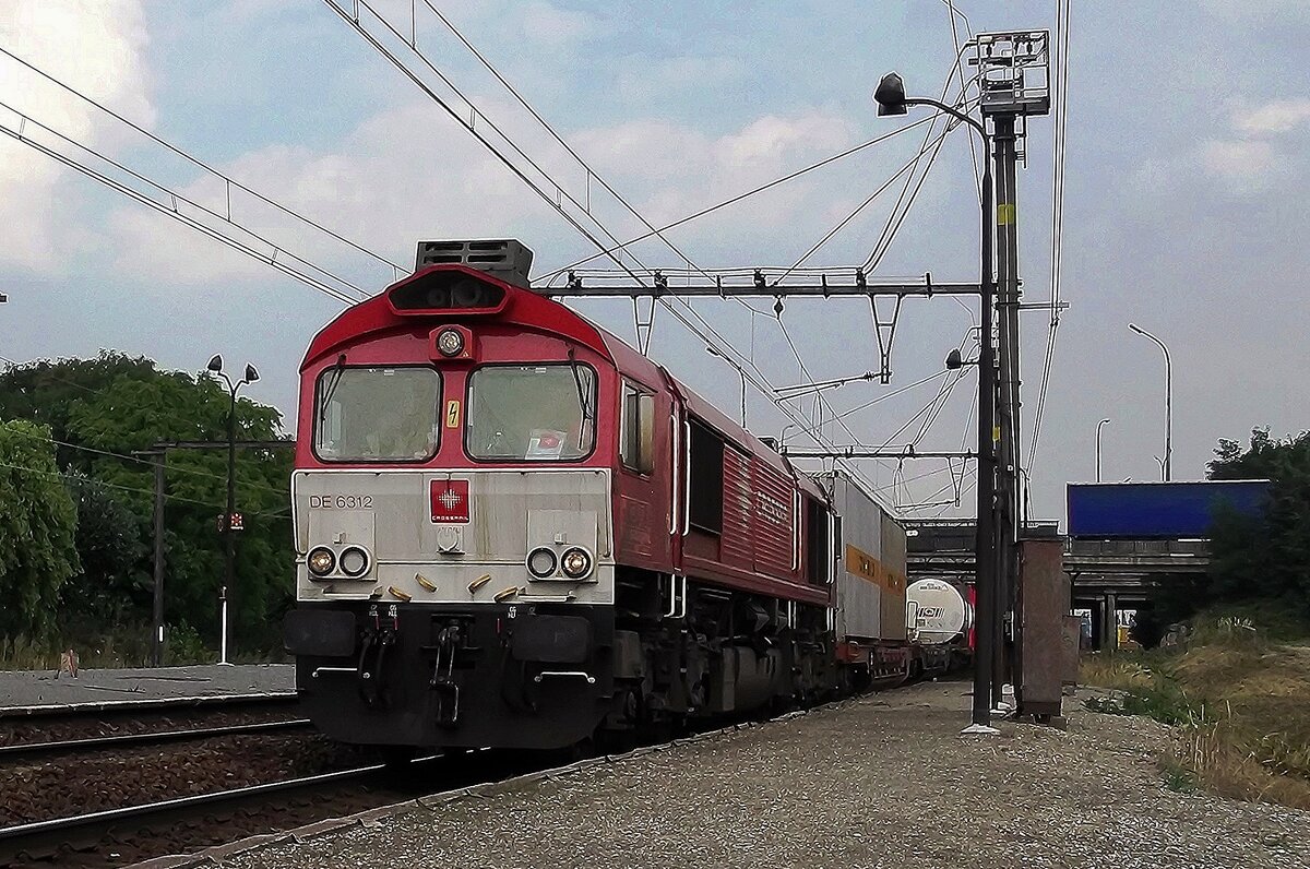 Froschblick auf Crossrail Benelux DE 6312 samt KLV beim Passage durch Antwerpen-Noorderdokken am 29 Augustus 2013.