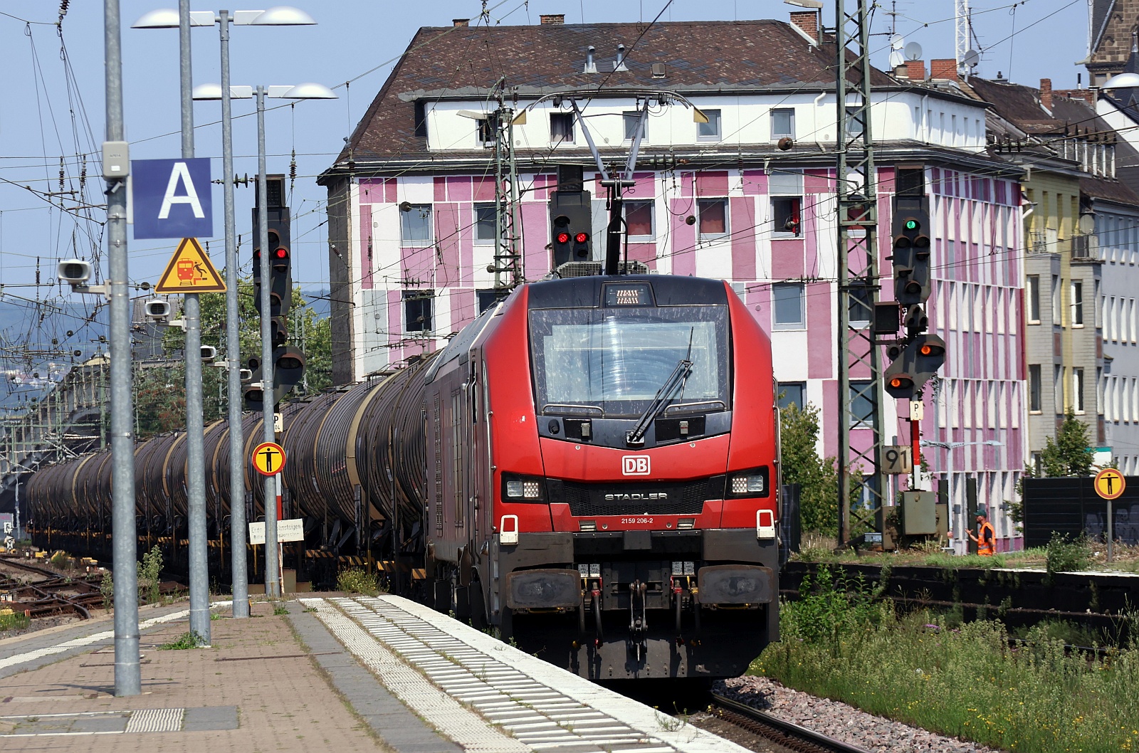 Ins Gegenlicht aufgenommen ist die Stadler Dual von HHPI an der Holzverladung in Neckarelz. 14.10.2025