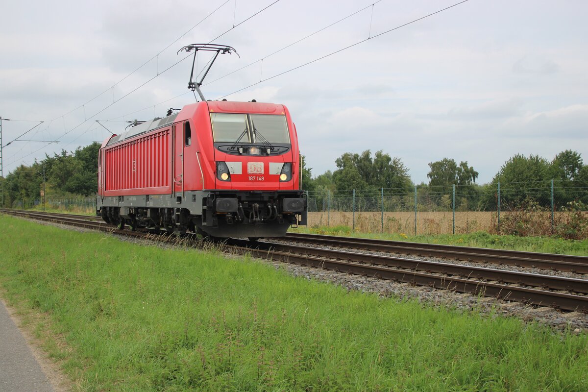 Die 185 151-8 (91 80 6185 151-8 D-DB) der DB Cargo AG fährt am 11 Juli 2025 mit der kalten 187 142-5 (91 80 6187 142-5 D-DB) und einem gemischten Güterzug durch Rudersdorf (Kr. Siegen) in Richtung Siegen.