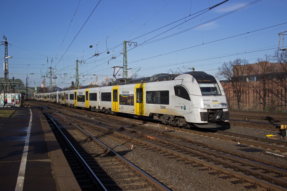 Ein weiterer der zahlreichen MRB-Desiros: 460 004 zusammen mit dem im Hintergrund sichtbaren 460 015 erreicht Köln Deutz.