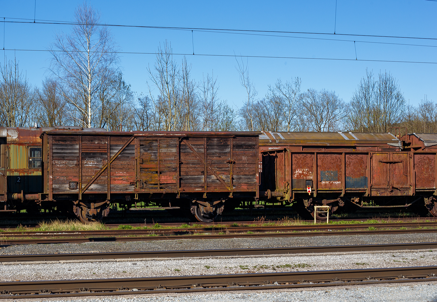 Güterwagen Nr. 8 (Vlmms 63) des DEV steht auf Rollböcken der Schmalspurbahn auf einem Nebengleis an der Haltestelle Heiligenberg. 15.09.2019 (Jeanny)