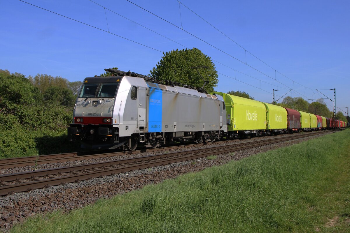 Die an die LINEAS Group NV/SA vermietete 186 504 (91 80 6186 504-7 D-Rpool) fährt am 08.04.2022 mit einem KLV-Zug durch den Bf Scheuerfeld (Sieg) in Richtung Siegen.